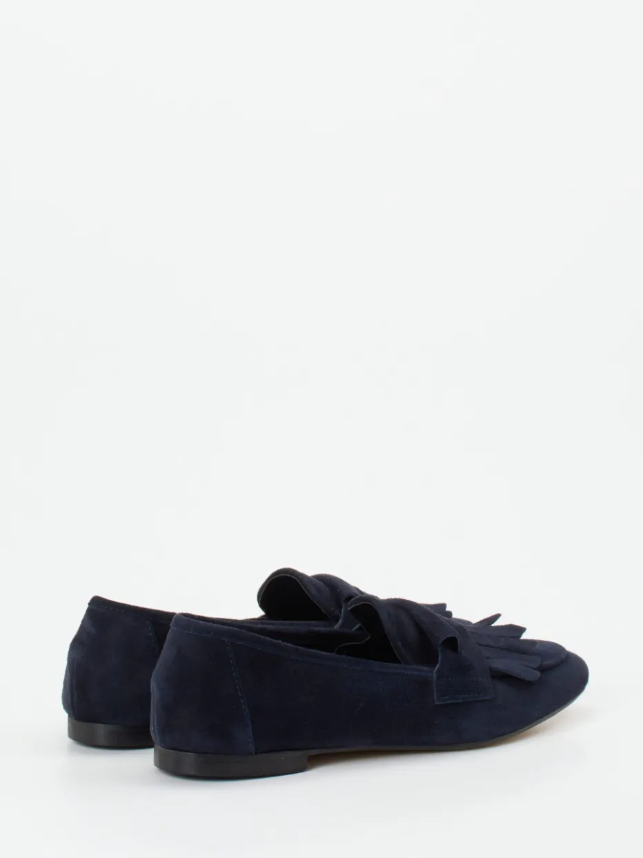 Verarbeitet aus hochwertigem, samtig-mattem Veloursleder in navyblauer Farbgebung, überzeugt das Modell mit klassisch flacher Silhouette, einer tonalen Fransenlasche samt feiner Zierspange und strukturgebenden Nähten. Die leichte Gummisohle mit 2 cm Absatz sorgt für Komfort im Business wie in der Freizeit. Modisch orientiert sich der Loafer an „Quiet Luxury“ und „Modern Heritage“ – und ergänzt klassische Outfits mit einer urban-minimalistischen Note.