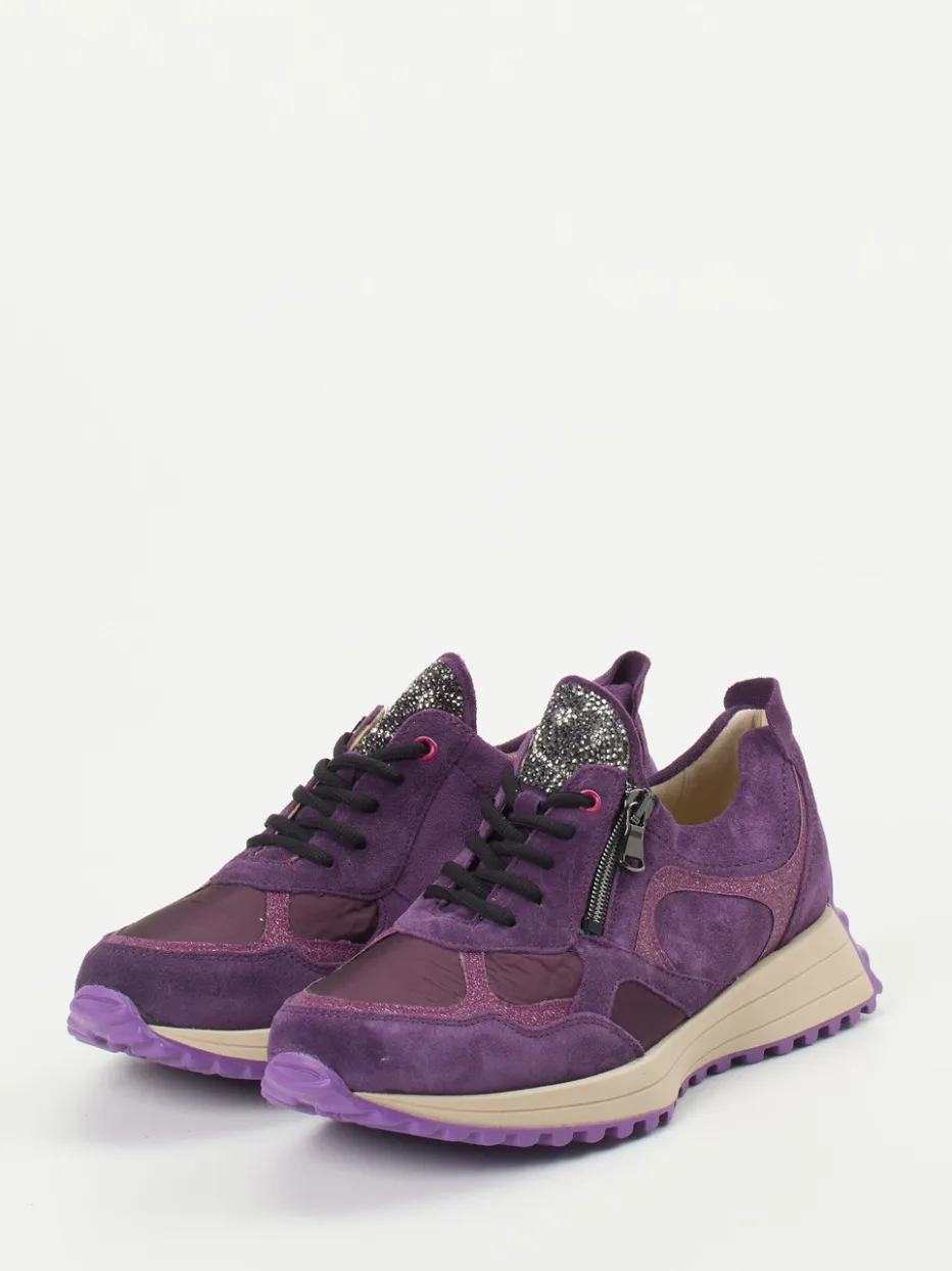 Statement für Alltag und Reise.Waldläufer zeigt mit diesem Freizeitsneaker ein besonders komfortables Damenmodell. In urbanem Alltag und auf Reisen überzeugt das Modell mit funktionalem Design und starker Stilwirkung. Samtig angeschliffenes Veloursleder in Violett trifft auf tonalen Textilmix sowie eine funkelnde Glitzerzunge. Ein seitlicher Reißverschluss ergänzt die Schnürung und erleichtert den Einstieg. Die leicht profilierte Gummisohle in Beige und Lila betont den dynamischen Charakter. Streetwear-Details und Color-Blocking-Trend zeigen modische Kompetenz. Harmoniert mit sportiven Jacken, Metallic-Taschen oder athleisure-inspirierten Outfits. Farbharmonisches Design mit integriertem Komfort – made for movement by Waldläufer.