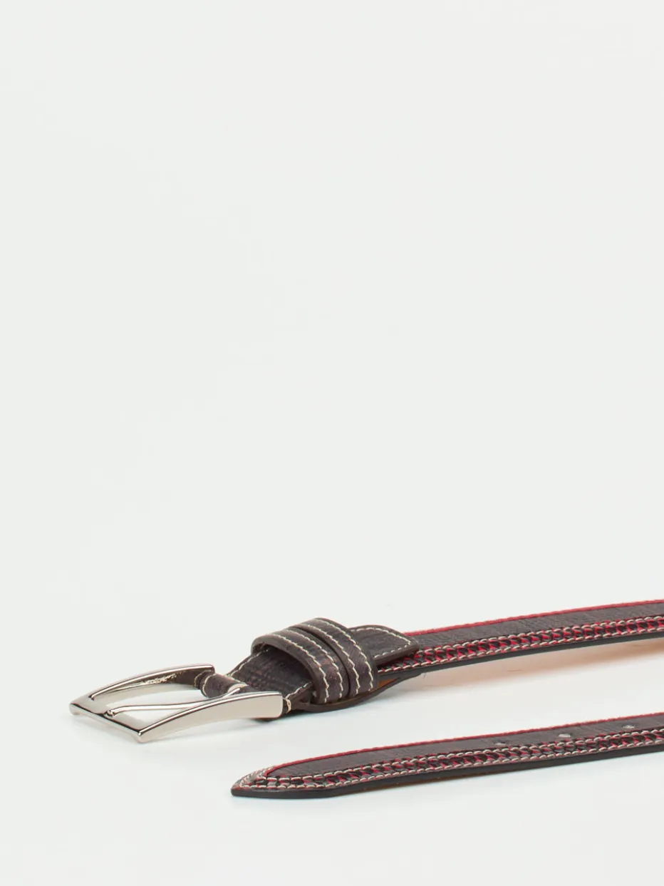 Fein gearbeitetes Druckleder mit Karomuster und akzentuierenden roten Nähten verleiht dem Gürtel von Harris einen markanten Heritage-Charakter. Die silberfarbene Schließe rundet das Design stimmig ab.