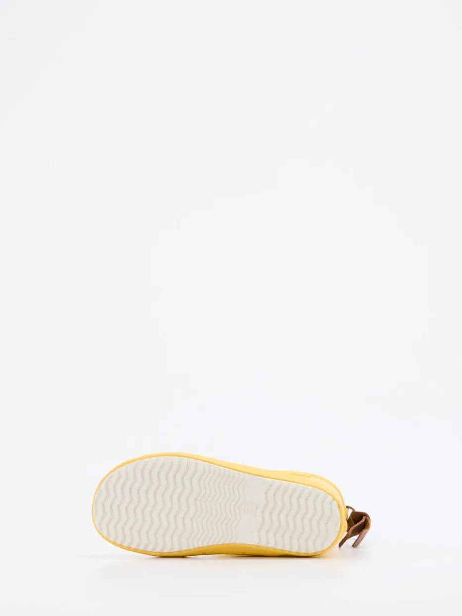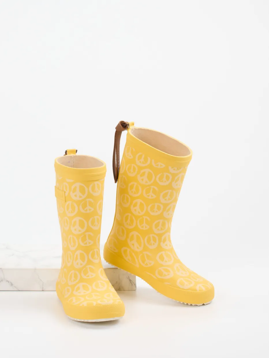 Ideal für Abenteuer bei Regenwetter.Bisgaard bietet mit diesen Kinder-Gummistiefeln ein wetterfestes Modell für Alltag und Freizeit. Mit dem auffälligen Peace-Print auf pastellgelbem, mattem Synthetik-Obermaterial bringen diese Stiefel Farbe in graue Tage. Die klassisch gerade Silhouette lässt sich einfach überstreifen; eine Zuglasche in kunstlederähnlicher Optik hinten erleichtert das Anziehen. Das beige Textilfutter sorgt für angenehmen Tragekomfort. Die helle, profilierte Gummisohle gewährleistet Rutschfestigkeit – auch auf nassem Untergrund. Ein spielerischer Look, der sich perfekt zu Regenjacken oder bunten Accessoires kombinieren lässt. Bisgaard steht für stilvolle Kinderschuhe mit durchdachter Funktion.