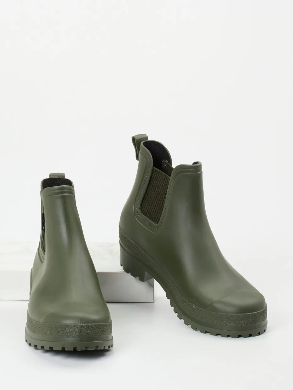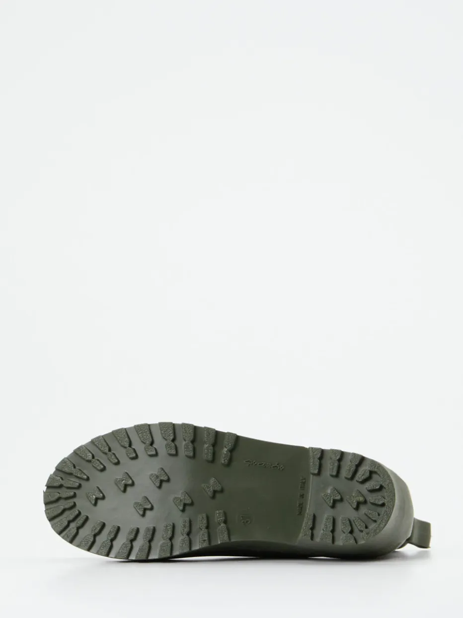 Diese olivgrüne Gummi-Stiefelette von Fischer überzeugt mit wetterfestem Material, markanter Profilsohle und minimalistischer Chelsea-Form – ein durchdachter Begleiter für urbane Regenoutfits.