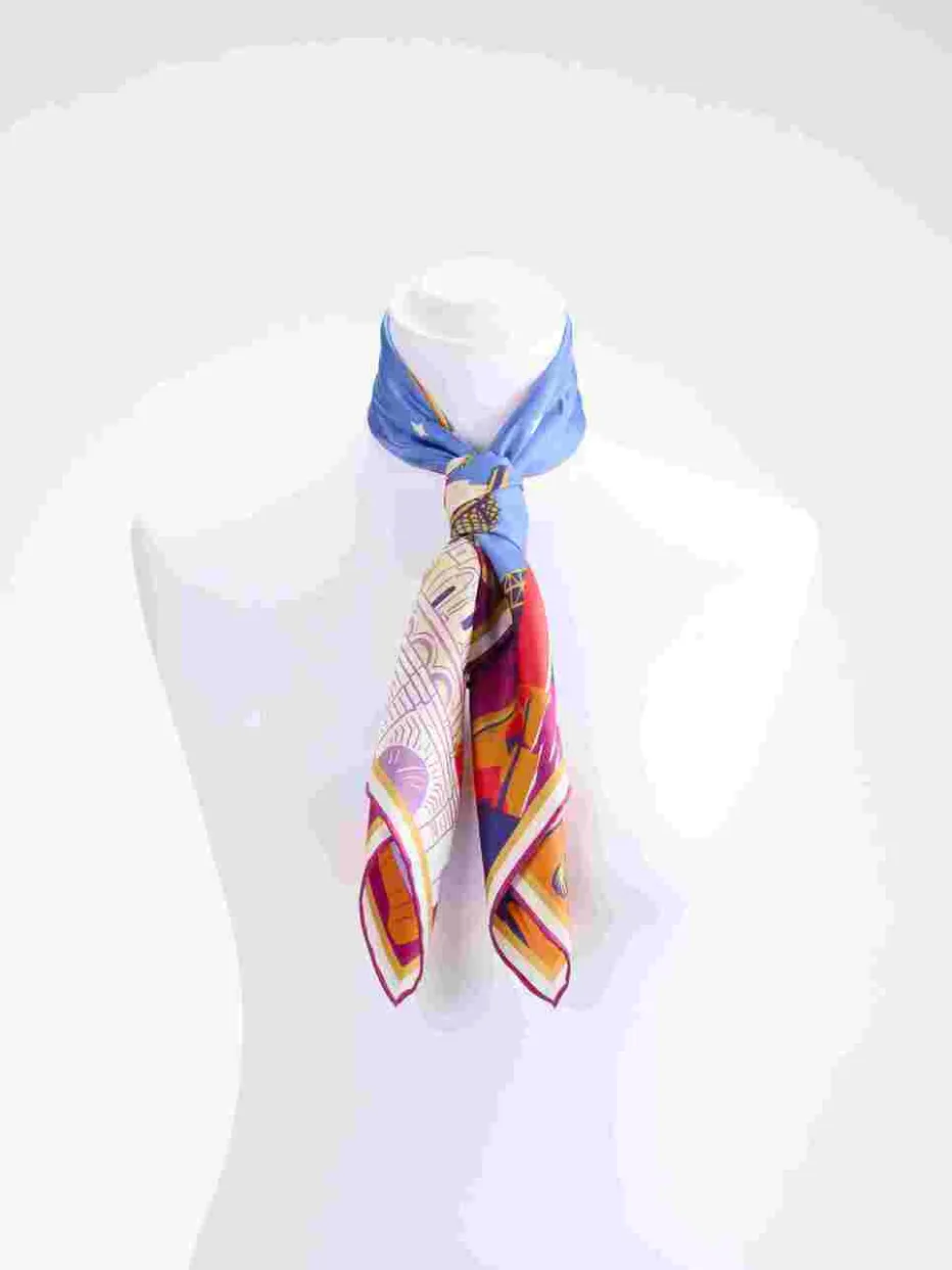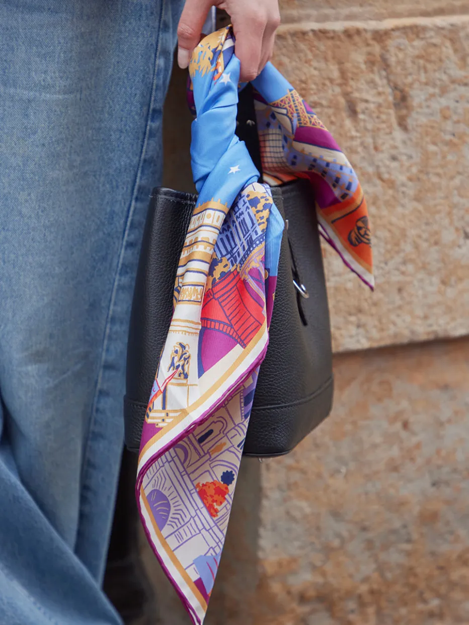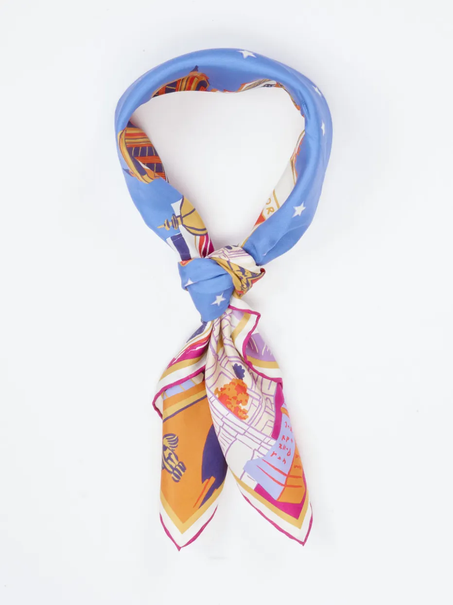 Hochwertige Seide trifft auf farbstarkes Design: Dieses Halstuch verbindet Pariser Charme mit sommerlicher Leichtigkeit und eignet sich ideal für trendbewusste Looks – ob am Hals, im Haar oder als Taschenakzent.