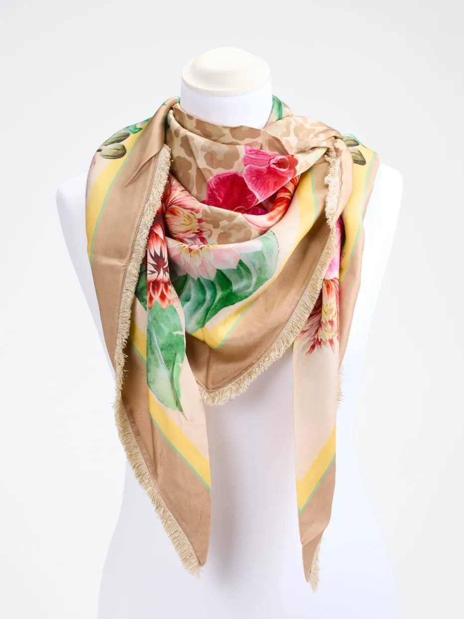 Mit floralem Maximal-Print und schimmerndem Finish verleiht dieses Tuch sommerlichen Outfits einen Hauch Exotik und Farbe.