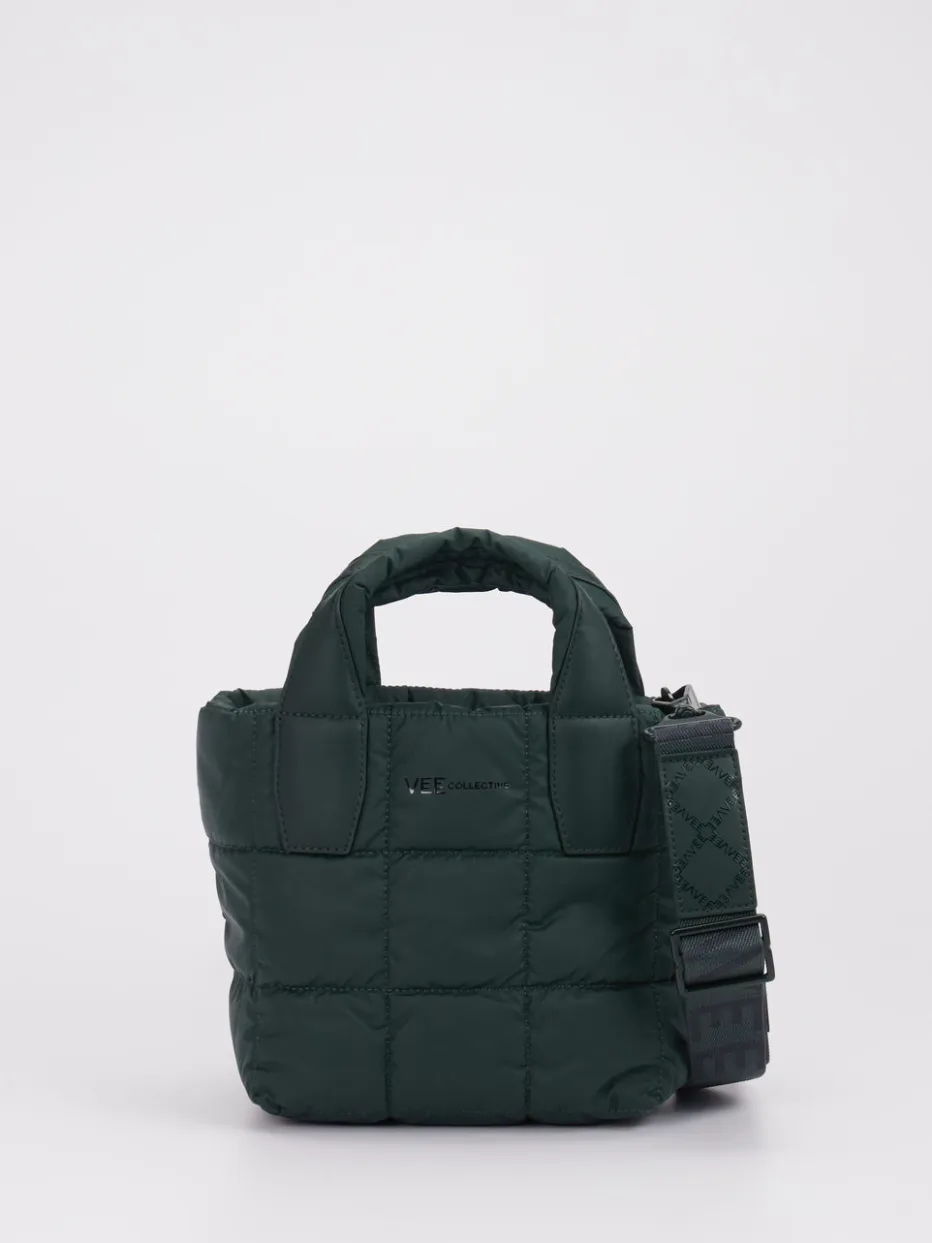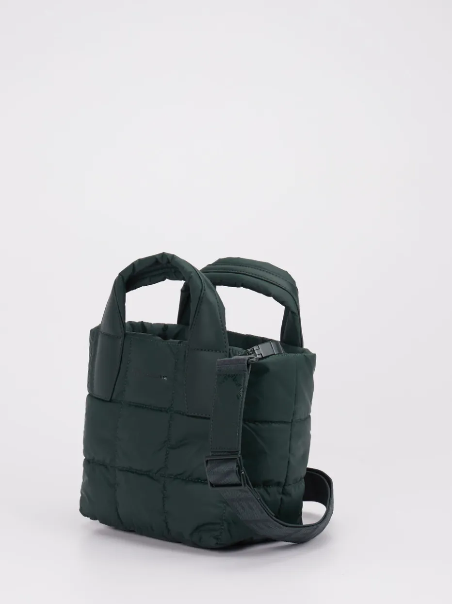 Minimalistisches Design trifft funktionalen Style: die Marke VeeCollective Berlin präsentiert mit dieser veganen Mini Tote Bag eine moderne Schulter- und Umhängetasche für Damen. Perfekt für entspannte Alltagsmomente bietet die gesteppte Tasche aus mattem Nylon in sattem Tannengrün ein stilvolles Update urbaner Freizeitlooks. Die rechteckige Silhouette mit abgerundeten Kanten wird durch gepolsterte Tragehenkel, einen breiten Schulterriemen mit Logowebung und tonale Steppnähte ergänzt. Praktische Details wie ein Innenkarabinerband, ein leichtgängiger Reißverschluss und das federleichte Gewicht runden die Funktion ab. Die Optik folgt aktuellen Trends wie „Quiet Utility“ und „Padded Bags“. Wasserabweisend, minimalistisch im Look – moderner Komfort mit Style-Bewusstsein.