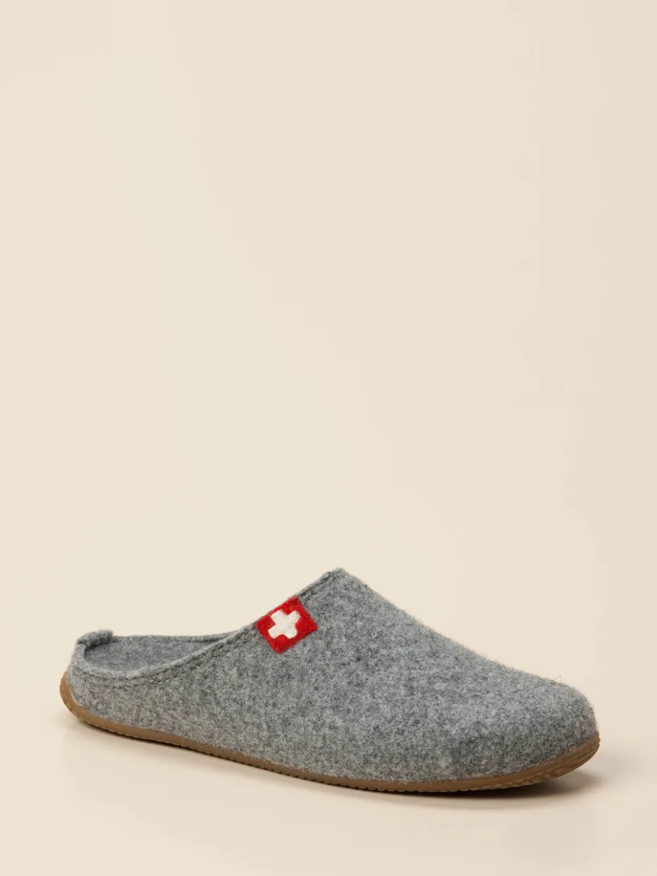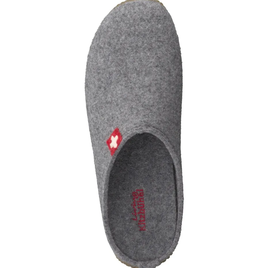 Wärme und Stil für entspannte Stunden.Living Kitzbühel bietet mit dieser Hauspantolette ein behagliches Accessoire für jedes Zuhause. Gefertigt aus wärmender Schurwolle mit filziger Oberfläche, überzeugt das Modell in einem ruhigen Grauton. Die geschlossene Vorderpartie und die offene Fersenform laden zum mühelosen Reinschlüpfen ein. Eine flexibel strukturierte Gummisohle schützt vor dem Ausrutschen, während ein rotes Filzemblem in Form des Schweizer Kreuzes einen markanten Designakzent setzt. Inspiriert vom Hüttentrend passt der Schuh ideal zu Strickmode und Loungewear. Die warme Textilinnensohle erhöht den Tragekomfort zusätzlich. Traditionelles Design trifft bei Living Kitzbühel auf unaufdringliche Alltagstauglichkeit.