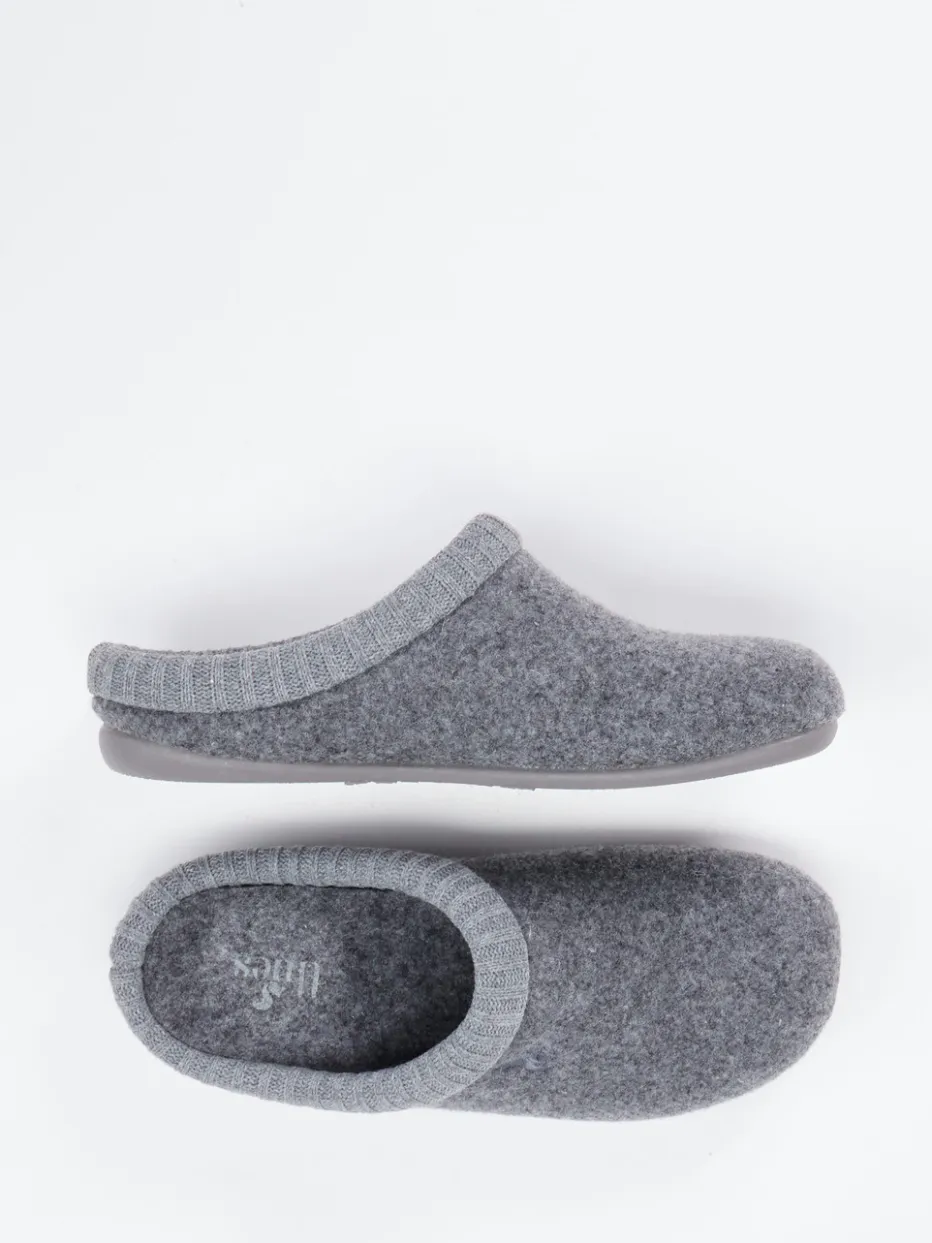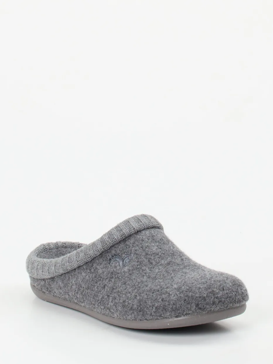 Aus hochwertigem Filz gearbeitet, zeigt das Modell in Mittelgrau eine filzige Textur mit subtiler Ton-in-Ton-Stickerei. Der gerippte Strickrand optimiert die Passform, während die ergonomische Gummisohle sicheren Halt bietet. Die farbliche Zurückhaltung und schlupffreundliche Verarbeitung wirken stilvoll und funktional zugleich – passend zum „Coziness Core“-Trend der Saison. Ein unkomplizierter Partner zu Loungewear und Heimtextilien.