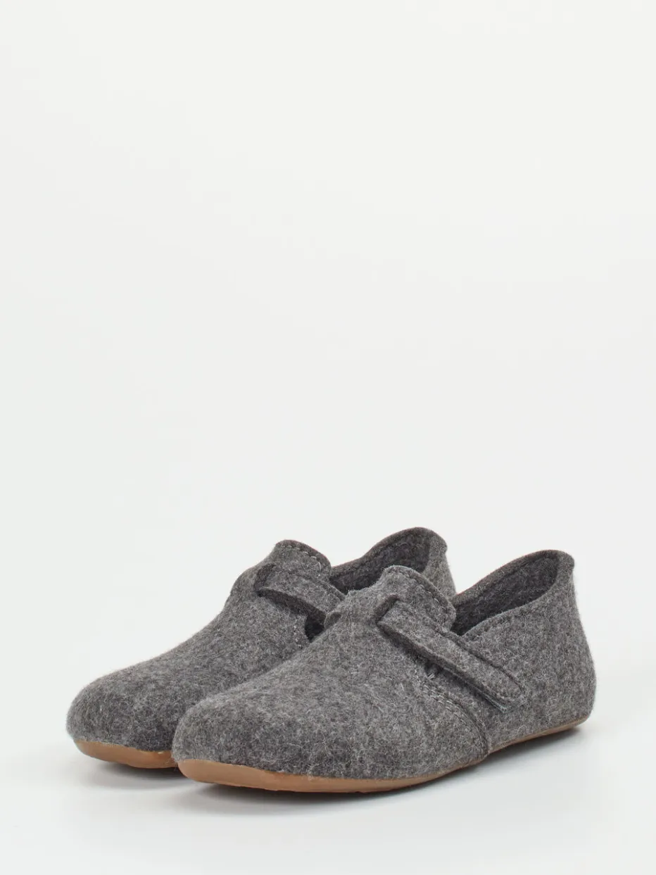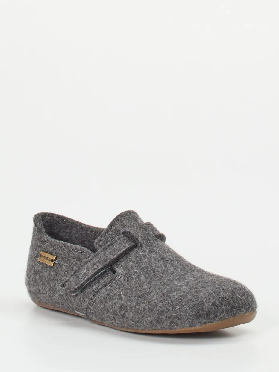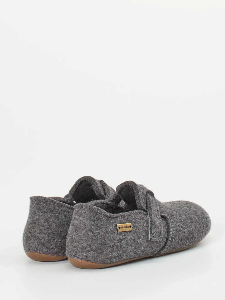 Schlicht. Warm. Wohnlich. Haflinger bietet mit diesem geschlossenen Hausschuh eine gemütliche Lösung für Anspruch und Alltag. Ideal für kalte Böden und lange Morgen vereint das Modell graue, filzige Schurwolle mit ergonomischem Komfort. Die flache Silhouette in Mittelgrau zeigt sich angenehm unauffällig, während der praktische Klettverschluss eine individuell regulierbare Passform ermöglicht. Ein goldfarbenes Markenlogo sowie der hochgezogene Rand runden das funktionale Design ab. Die rutschfeste Gummisohle verspricht sicheren Halt auf glatten Untergründen. Inspiriert von Loungewear und der „Slow Living Aesthetic“ fügt sich dieser Schuh harmonisch in natürliche Wohnkonzepte ein. Wertiger Komfort aus reiner Wolle mit entspannter Eleganz – typisch Haflinger.