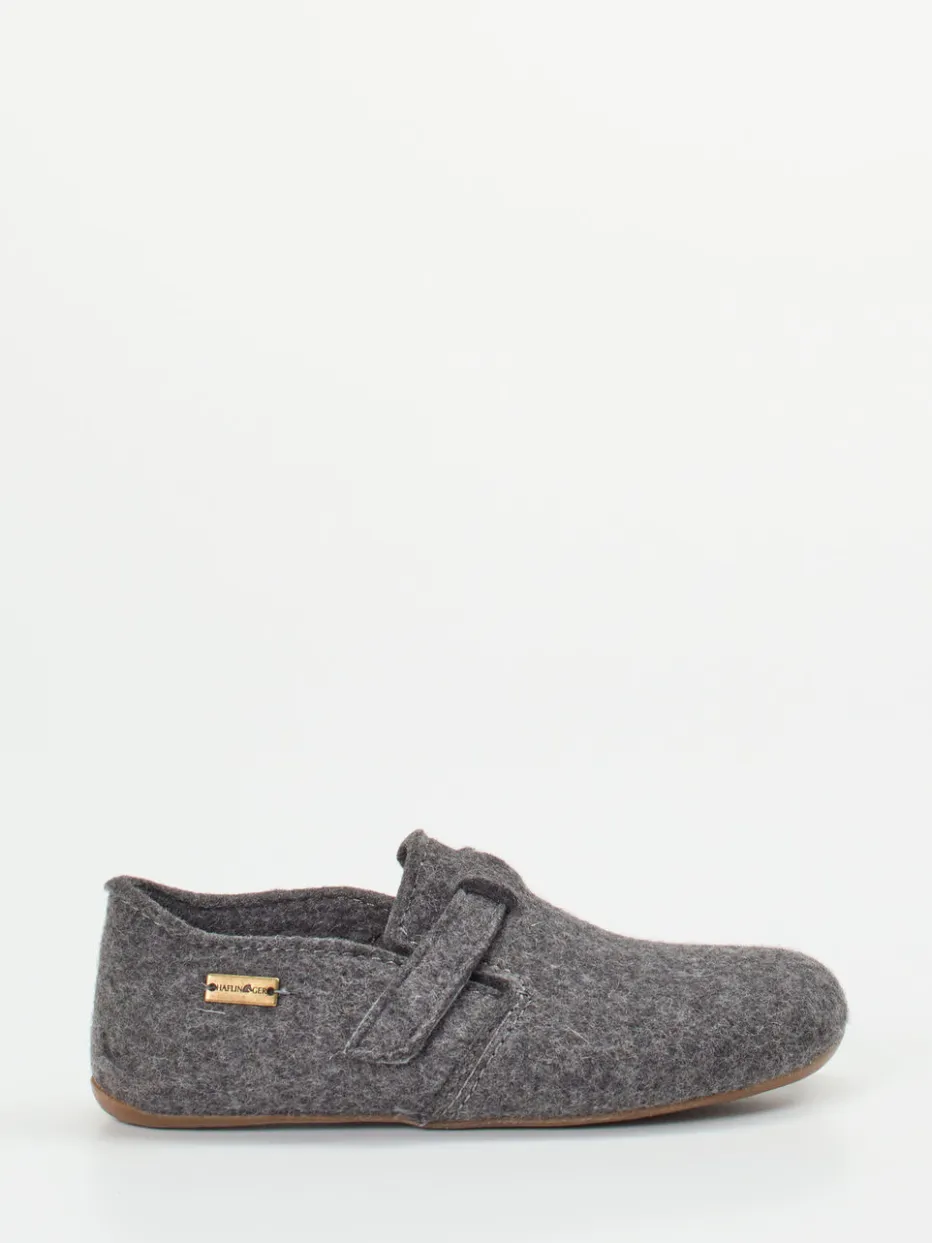 Filzpantoffel aus reiner Schurwolle mit goldfarbenem Logo und komfortabler Passform. Die klettverschlossene Silhouette verbindet Minimalismus mit durchdachter Funktion für entspannte Stunden daheim.