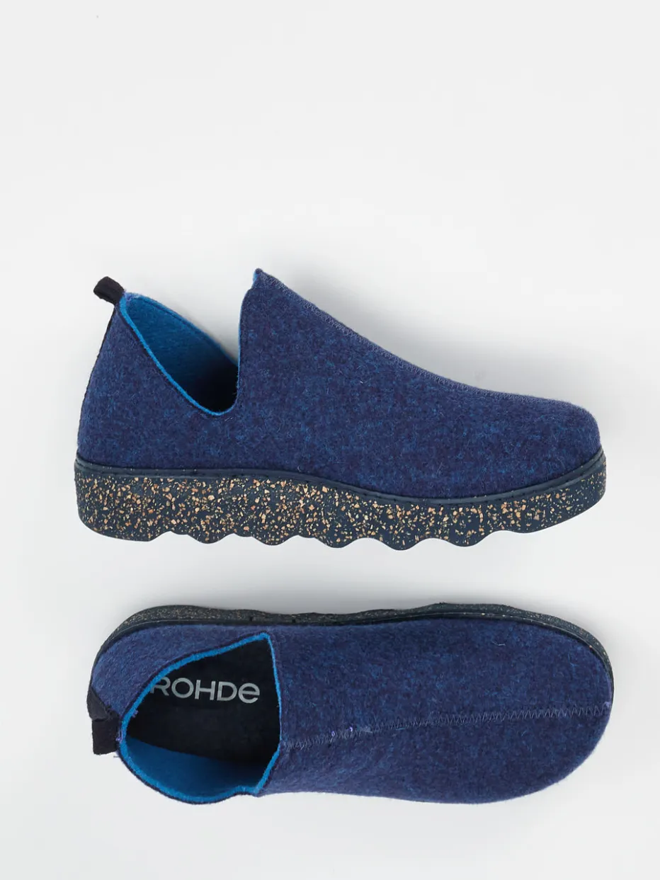 Reduzierter Komfort trifft Stil.Der Hausschuh von Rohde überzeugt als Slip-On-Pantoffel mit stilvollem Minimalismus. Ideal für gemütliche Momente zu Hause bietet das Modell aus kobaltblauem Softfilz ein angenehm weiches Tragegefühl. Die gesprenkelte Gummisohle mit anatomischer Formgebung sorgt für Trittsicherheit auf glatten Böden. Die rundliche Silhouette, sichtbare Nähte und eine rückseitige Zuglasche unterstreichen das funktionale Design. Petrolfarbenes Innenfutter bringt dezente Akzente. Im Trend der „Quiet Luxury“-Bewegung ist der Schuh die perfekte Wahl für alle, die bewusst schlichtes Design mit natürlichen Materialien kombinieren wollen. Authentischer Wohlfühlstil mit der Handschrift von Rohde.