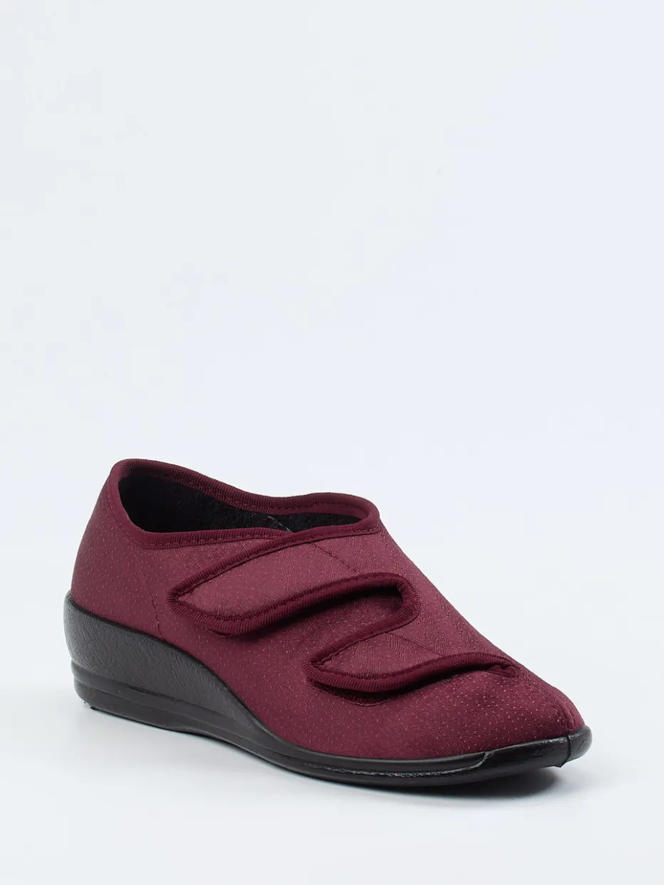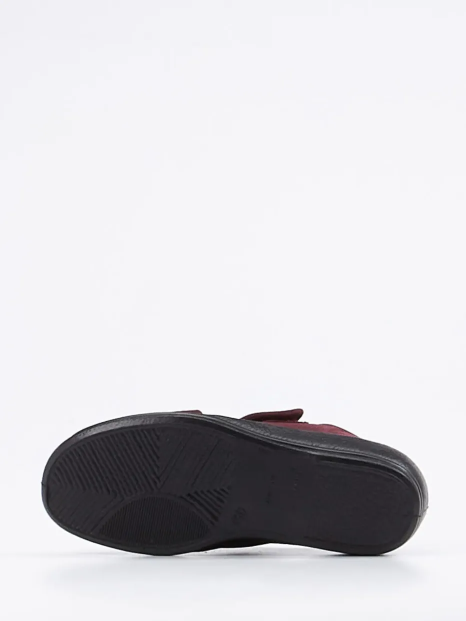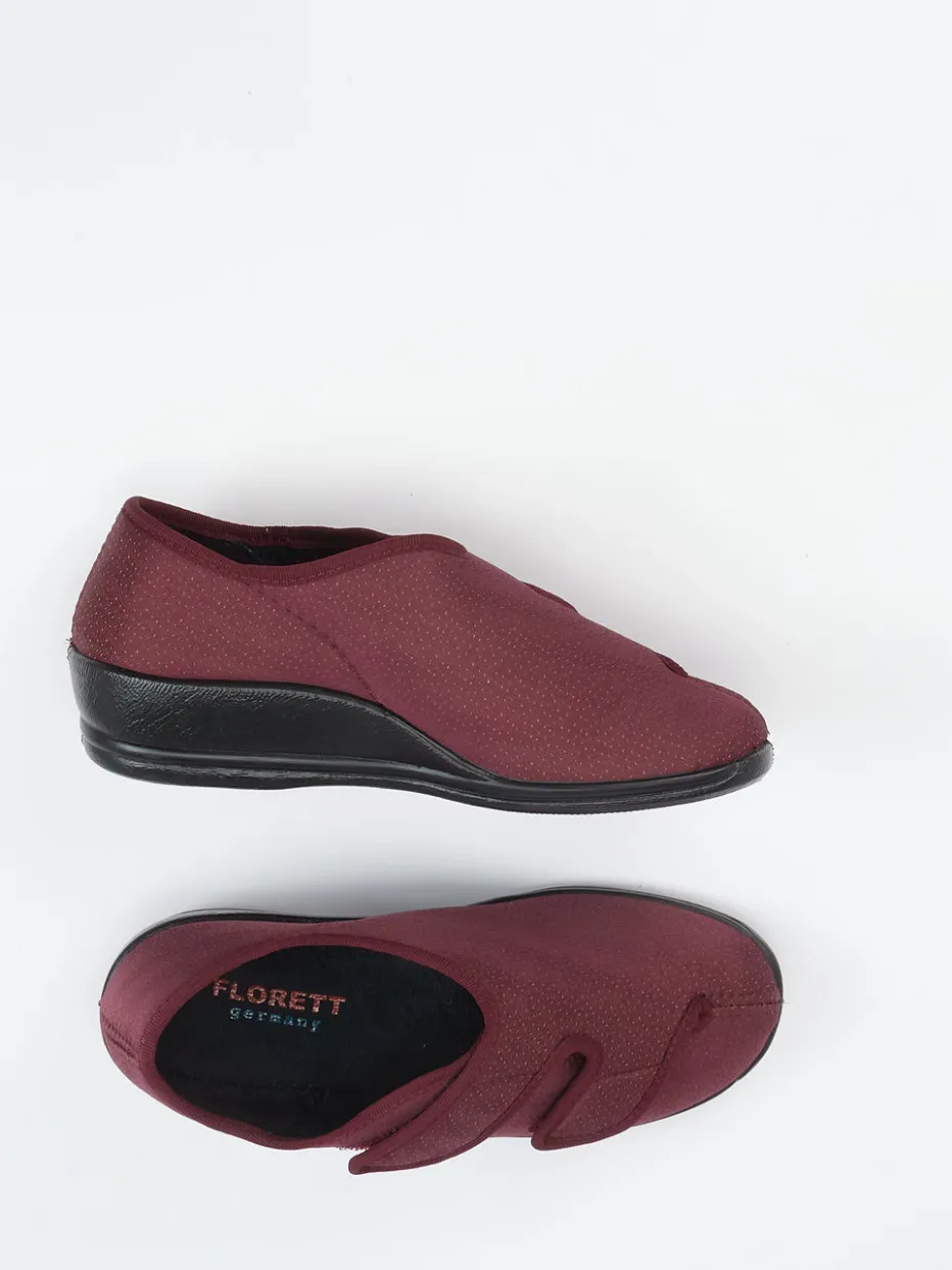 Flexibler Komfort für entspannte Stunden.Der Damen-Hausschuh aus der Florett-Kollektion von Varomed kombiniert durchdachten Komfort mit einem stilvollen Look. Ideal für gemütliche Alltagsmomente bietet das Modell „Beate“ dank seiner ergonomisch geformten PU-Sohle einen angenehm weichen Auftritt. Das bordeauxrote Textilmaterial zeigt eine matte Oberfläche mit subtilem Glanz durch feine Strukturpunkte. Zwei breite Klettverschlüsse ermöglichen eine individuelle Weitenanpassung – besonders praktisch bei kräftigeren Füßen. Das weiche Frottee-Innenfutter schafft ein ausgeglichenes Fußklima, während das unifarbene Design mit Ton-in-Ton-Nähten dezent bleibt. Ein funktionaler Begleiter für zuhause und für alle, die Wert auf Bequemlichkeit legen. Komfort und Passform aus dem Hause Varomed – stilvoll umgesetzt.
