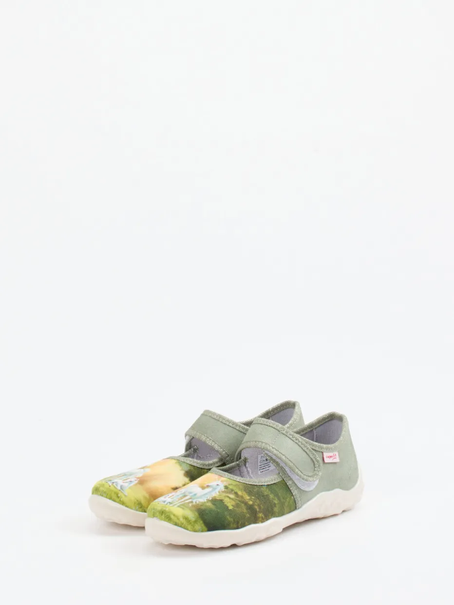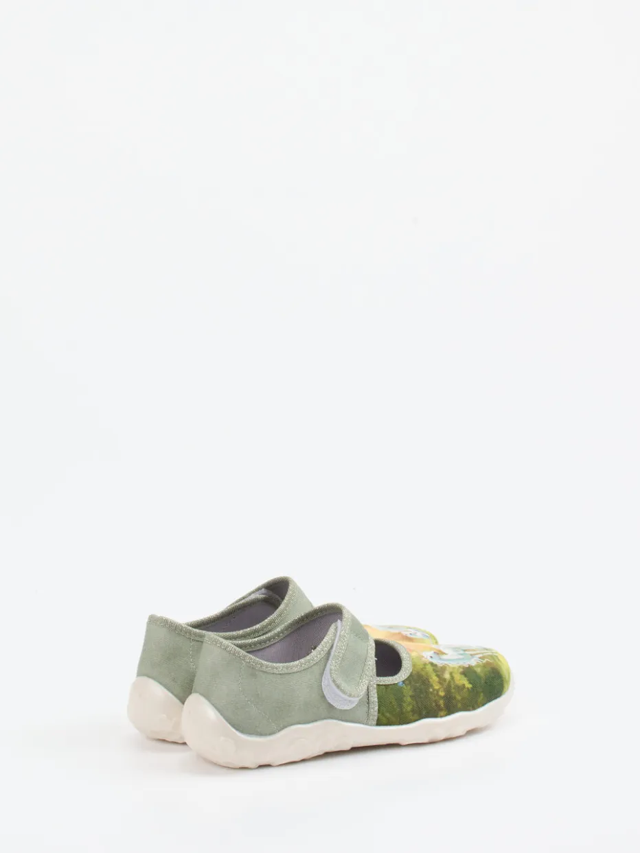 Verspieltes Design für kleine Entdecker.Superfit präsentiert einen komfortablen Kinderhausschuh in klassischer Ballerinaform. Ob zu Hause oder im Kita-Alltag – der Kletthausschuh erfüllt den Wunsch nach bequemen und sicheren Bewegungen. Gefertigt aus grünem Textil mit samtigem Finish und zauberhaftem Einhorn-Fotoprint, wird er durch eine silberfarbene Einfassung und eine runde Silhouette ergänzt. Der Klettverschluss erleichtert das Anziehen, während die flexible PU-Sohle mit floraler Prägung sicheren Halt bietet. Märchenhafte Motive und kindgerechte Funktion verbinden sich zu einem verspielten Trendstück der Saison. Ideal zu Leggings und Hoodie im Einhorn-Look kombinierbar. Gekonntes Zusammenspiel von Komfort, Funktion und Fantasie zeichnet Superfit aus.
