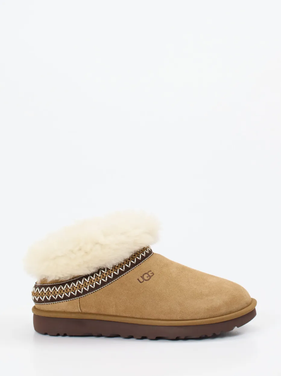 Design trifft Hygge-Ambiente.UGG interpretiert klassische Hausschuhe neu: Dieser Damen-Slipper aus Veloursleder kombiniert Komfort mit einem Hauch nordischem Chic. Ob zum entspannten Lesenachmittag oder dem gemütlichen Kaffeegenuss auf der Terrasse – das hellbraune Veloursleder erhält durch seine matte Oberfläche sowie das weiche Lammfellfutter eine besonders edle Haptik. Die geschlossene, rund geformte Silhouette mit Zickzackborte in Wollweiß und Dunkelbraun verleiht dem Hausschuh einen Vintage-Twist. Dank griffiger Gummisohle lässt sich der Look auch im Garten oder auf Balkonwegen tragen. Ein wohliger Begleiter für „Quiet Luxury“-Liebhaberinnen. UGG überzeugt mit markentypischer Qualität und nordischer Gemütlichkeit.