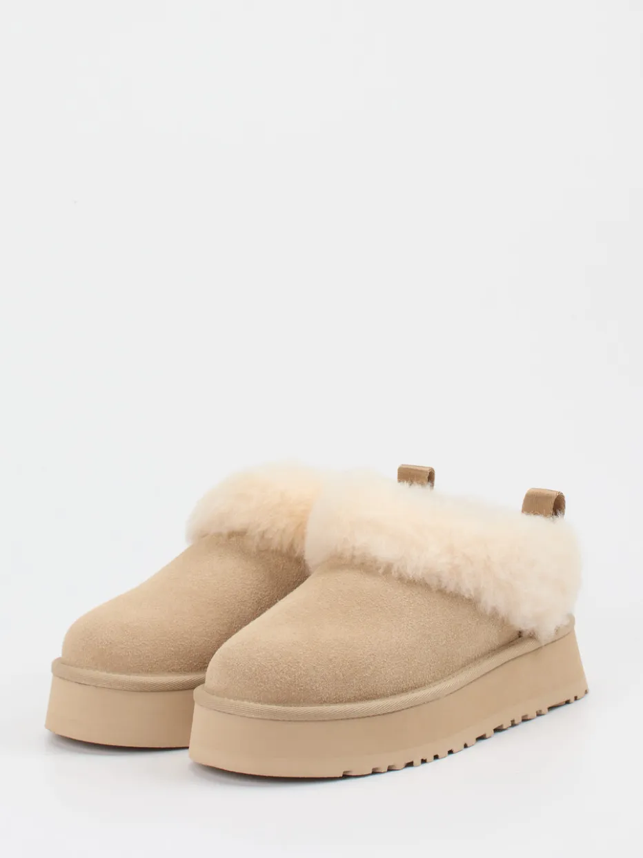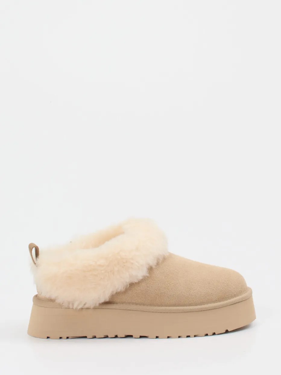 Kuscheliger Begleiter für kalte Tage.Der Damenhausschuh von UGG kombiniert modischen Anspruch mit behaglichem Tragekomfort. Ideal für ruhige Abende zu Hause oder entspannte Wochenendmomente: Das beige Veloursleder wirkt edel und wird durch flauschiges, cremeweißes Lammfell stilvoll ergänzt. Die rund geschlossene Form mit mattem Finish und sichtbarer Fellkante ist puristisch, aber modern. Die profilierte Plateausohle gibt Halt und bringt einen frischen Loungewear-Twist. Dank Schlupfform und praktischer hinterer Zuglasche punktet er auch funktional. Harmoniert hervorragend mit gemütlichen Strick-Teilen oder weiten Loungepants. Warme Qualität und authentische Materialanmutung – typisch UGG.