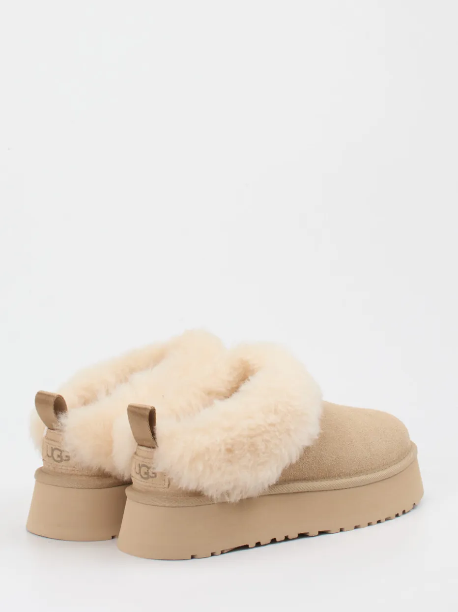 UGG vereint warm gefütterten Komfort mit trendiger Plateausohle – perfekt für entspannte Stunden im Winter. Das matte Veloursleder und echte Lammfell schaffen ein stilvolles Loungewear-Statement.