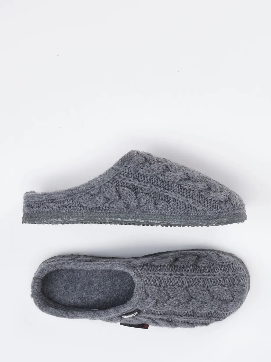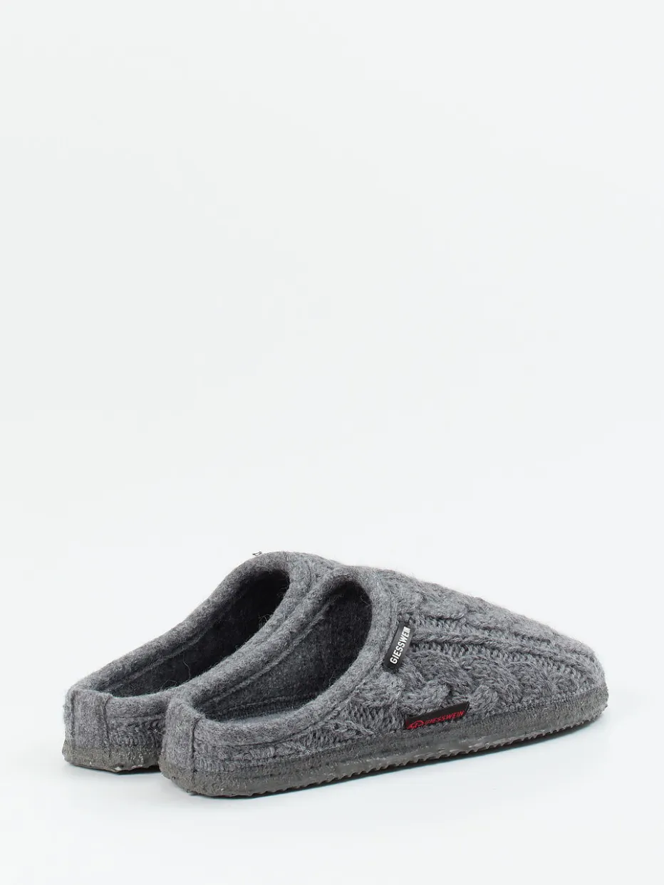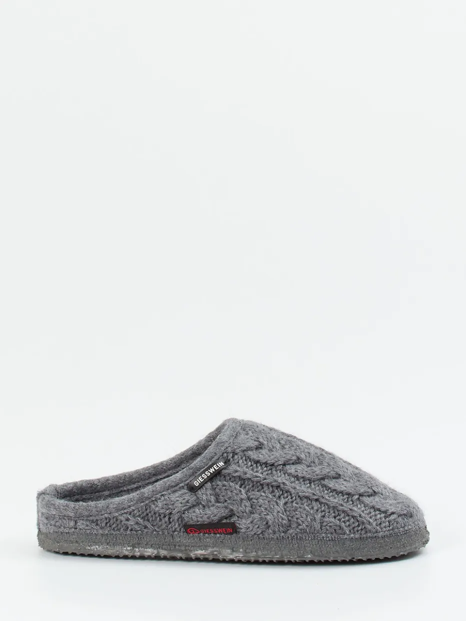 Gemütlich durch kühle Tage.Giesswein präsentiert einen hochwertigen Hausschuh für entspannte Momente. Perfekt für kalte Böden im Winter oder gemütliche Abende in den eigenen vier Wänden: Aus reiner, weicher Schurwolle gefertigt, trägt sich das graue Modell mit filziger Haptik besonders angenehm. Das klassische Zopfmuster in Ton-in-Ton sowie die offene Ferse unterstreichen den loungigen Charakter. Eine flexible, mit Naturkautschuk beschichtete Gummisohle sorgt für Trittsicherheit. Dank wohnlicher Formgebung und alpine-inspirierter Details passt der Schuh ideal zur Loungewear oder zu Wollsocken. Ein langlebiger Begleiter für authentischen Giesswein-Komfort.