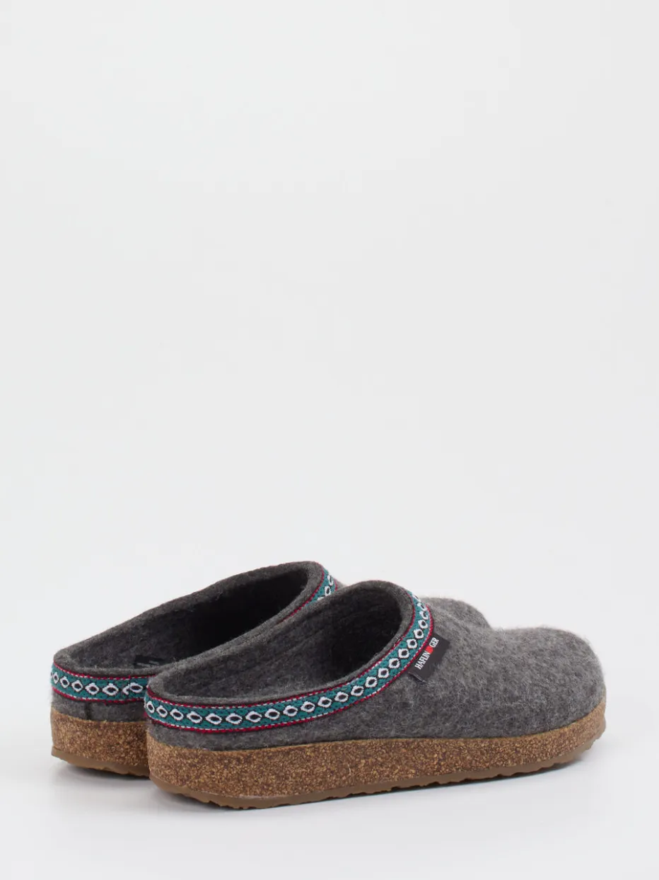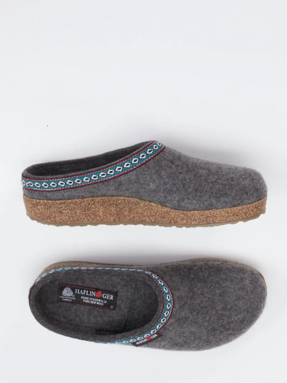 Wohlfühlen beginnt mit den Füßen.Haflinger präsentiert mit diesem Hausschuh eine gemütliche Lösung für entspannte Stunden daheim. Ideal für kühle Böden und ruhige Abende: Der geschlossene Pantoffel aus grauem Wollfilz sorgt dank seiner filzigen Oberfläche für ein angenehmes Fußklima. Das anatomisch geformte Fußbett aus Kork und die griffige Profillaufsohle aus Gummi bieten Stabilität und Komfort. Eine bunte Borte mit Ethnomuster setzt visuelle Akzente im alpinen Stil. Der offene Fersenbereich erleichtert das Hineinschlüpfen – ganz ohne Verschluss. Das Modell passt perfekt zu Loungewear oder Stricksocken. Haflinger steht für natürliche Materialien, nachhaltige Verarbeitung und zeitlose Hausschuhkultur.