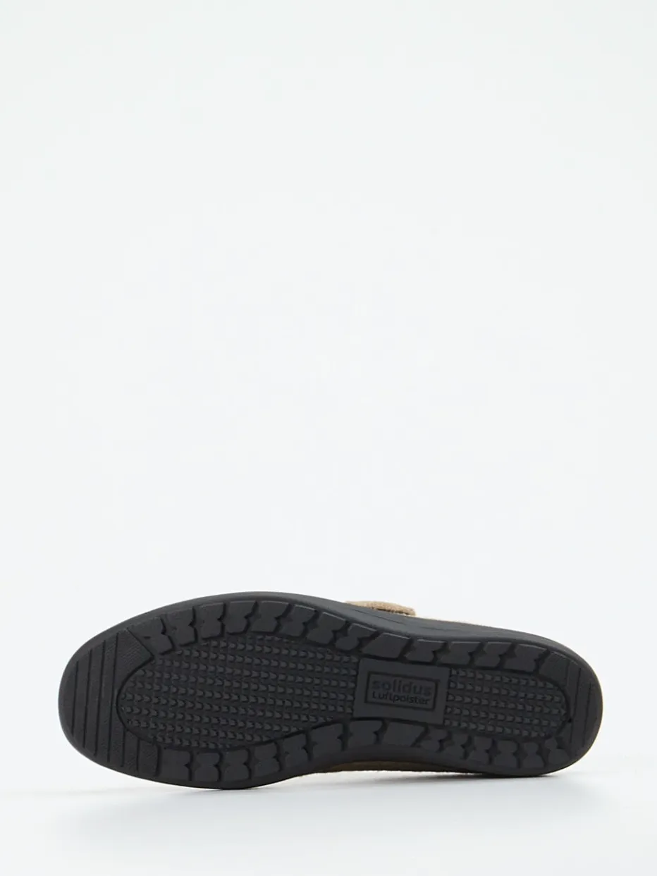 Wohltuender Komfort für Zuhause.Der Damen-Hausschuh von Solidus überzeugt in klassischer Pantolette-Form mit zeitgemäßem Komfortanspruch. Ideal für entspannte Stunden daheim: Der beigebraune Hausschuh aus filzigem Wollfilz punktet mit einem individuell verstellbaren Klettverschluss und dekorativer Metallapplikation. Die ergonomisch aufgebaute Laufsohle mit Luftpolster sorgt für Trittsicherheit und langanhaltenden Tragekomfort. Das herausnehmbare Fußbett aus Kork ergänzt die funktionale Ausstattung. Mit seinem minimalistischen Design fügt sich der Schuh stilsicher in moderne Loungewear-Kombinationen ein. Ein natürlich gestalteter Wohlfühlschuh mit der bekannten Solidus-Passform.