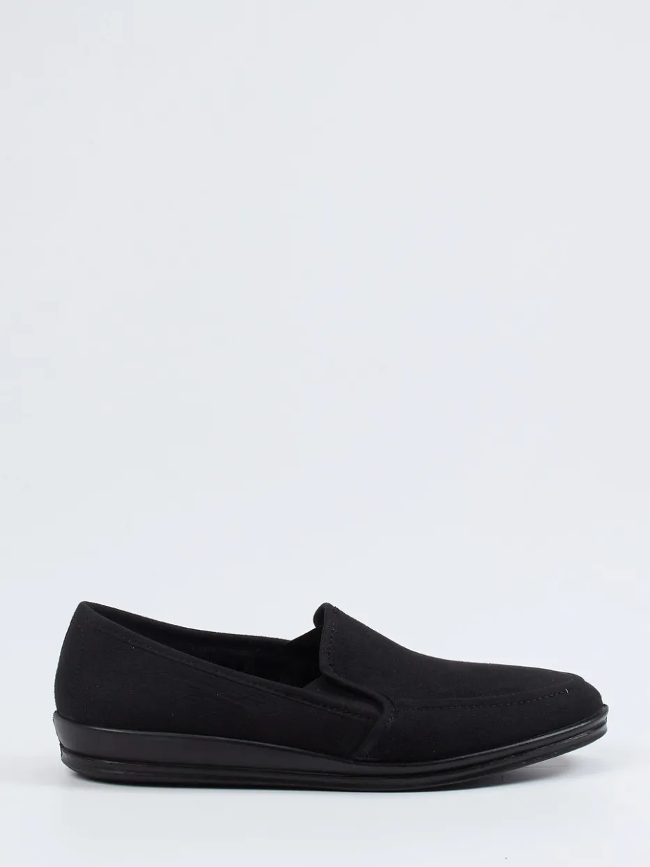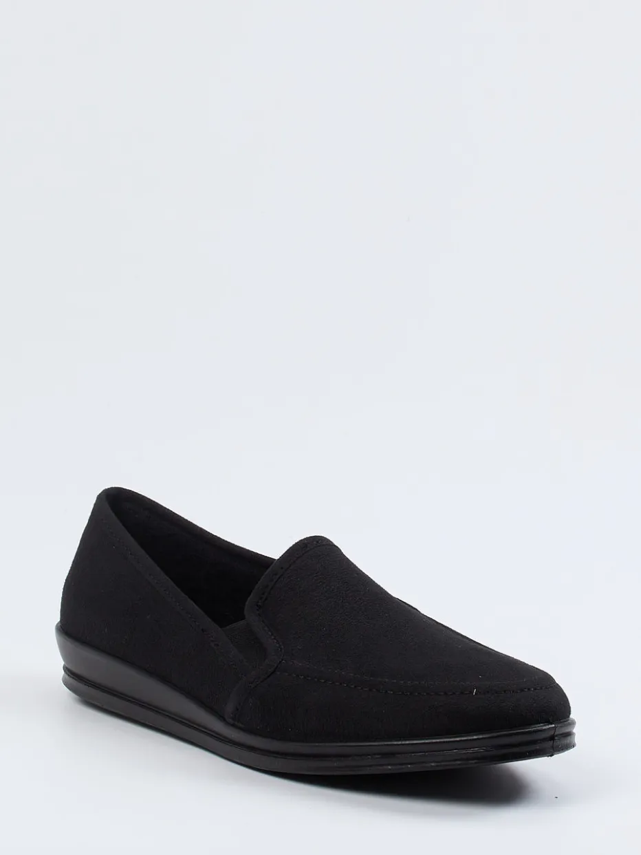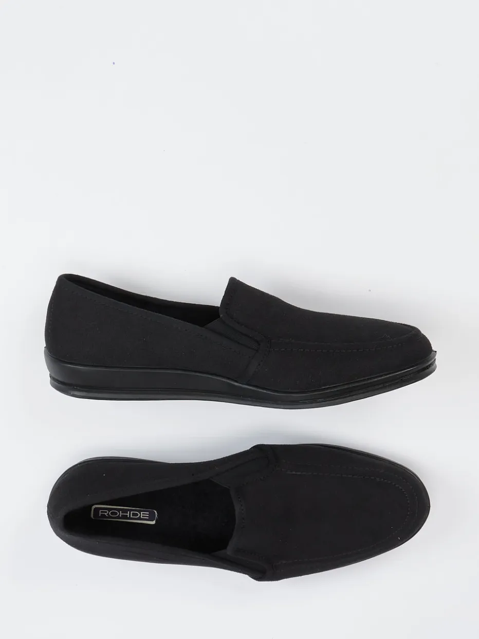 Minimalismus trifft Wohlgefühl.Rohde präsentiert mit diesem Hausschuh-Slipper einen komfortbetonten Begleiter für entspannte Stunden daheim. Die matte Textiloberfläche in Veloursoptik bringt den schlichten Charakter des schwarzen Slippers zur Geltung. Zwei seitliche Elastikeinsätze erleichtern den Einstieg und formen gemeinsam mit der flachen Silhouette ein dezentes Loungewear-Piece. Das wärmende Innenfutter aus Wolle sorgt für ein angenehm softes Tragegefühl. In Design und Funktion orientiert sich das Modell an aktuellen „Quiet Luxury“- und „Soft Comfort“-Trends – eine Wahl für stilbewusste Komfortliebhaber. Unaufdringlicher Look mit markentypischer Leichtigkeit von Rohde.