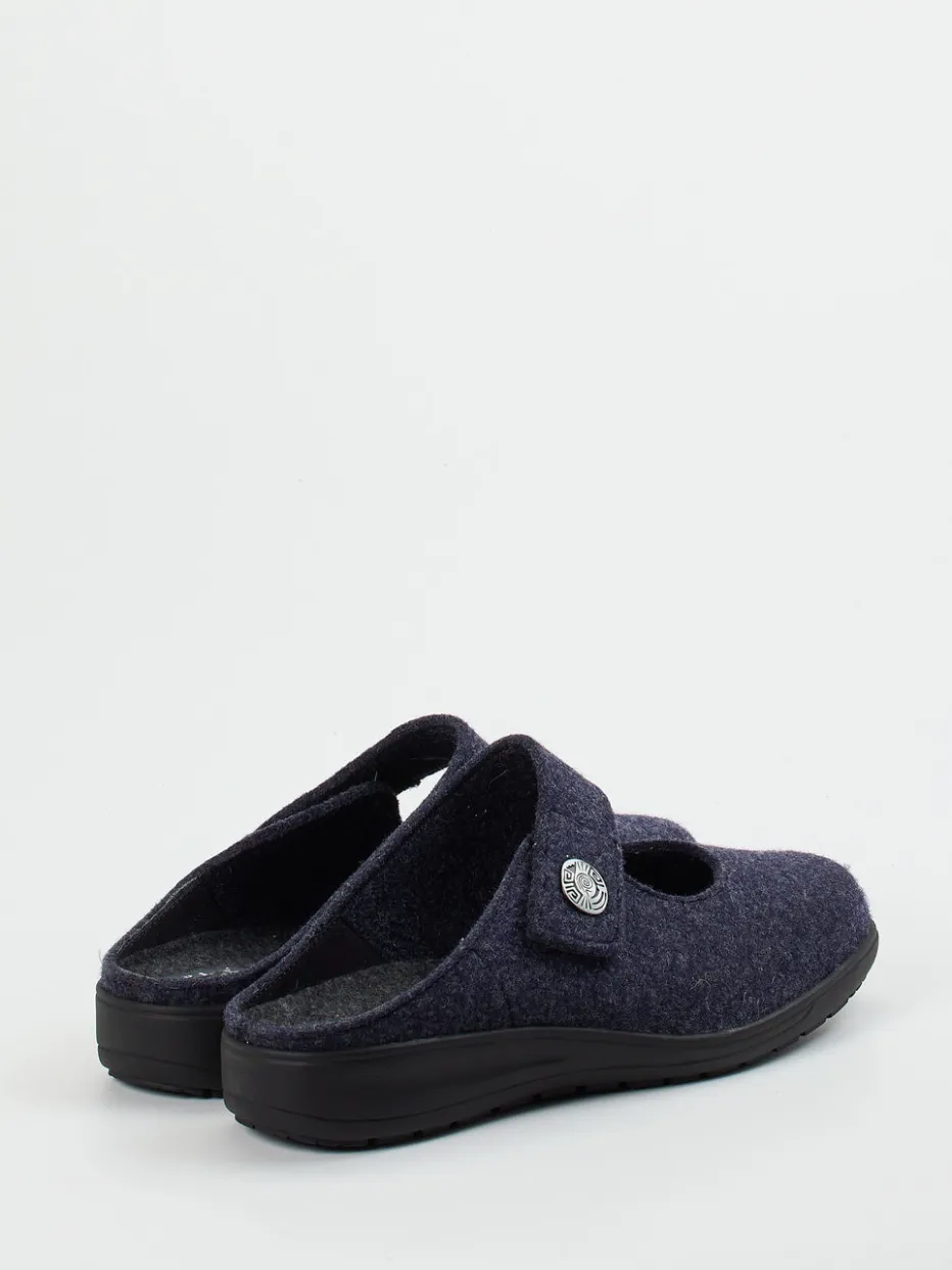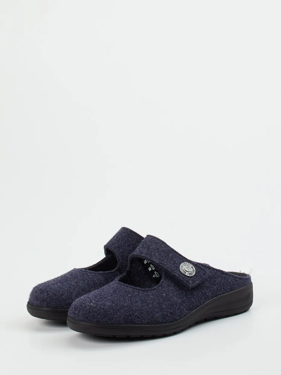 Wohltuender Komfort für den Alltag.Solidus präsentiert bequeme Damen-Hausschuhe in komfortabler Pantolettenform. Ideal für entspannte Stunden daheim: Das weiche, dunkelblau-melierte Filzmaterial sorgt für ein angenehmes Tragegefühl. Die ergonomisch geformte Luftpolstersohle bietet eine gelenkschonende Grundlage, während der individuell verstellbare Klettverschluss für optimalen Halt sorgt. Eine silberfarbene Zierschnalle setzt einen feinen Akzent auf dem funktionalen Design. Die hinten offene Silhouette betont die unkomplizierte Handhabung. Inspiriert vom Minimalismus und aktuellen Indoor-Trends passen sie ideal zu Hausanzug oder Wollsocken. Mit hochwertiger Verarbeitung und ausgewogenem Komfort – typisch Solidus.