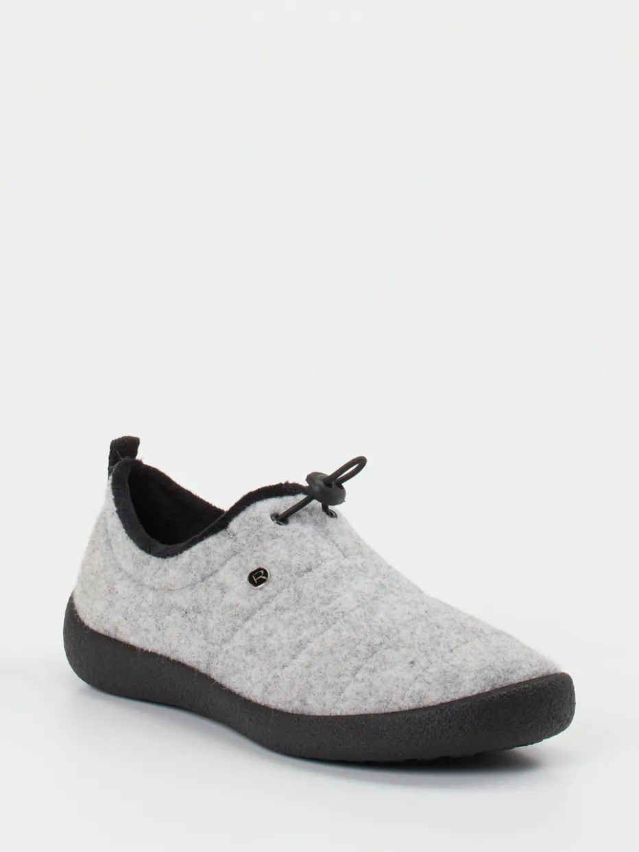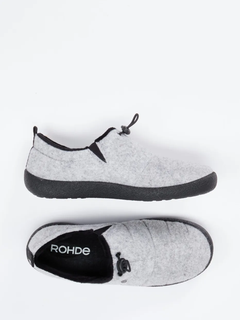 Wohlfühlen beginnt bei den Füßen.Rohde präsentiert mit diesen Hausschuhen ein Modell, das Komfort und Stil verbindet. Für entspannte Stunden auf heimischem Parkett sorgt das hellgraue Filzmaterial – angenehm weich und mit samtartiger Textur. Die kompakte Slipperform überzeugt durch einen passgenauen Sitz, unterstützt durch den funktionalen Kordelzug. Schwarze Einfassungen und ein ebenso farbiges Innenfutter aus Textil setzen dezente Akzente. Die stabile Gummisohle bietet Rutschfestigkeit und trägt den Comfort-Core-Trend stilsicher in den Alltag. Perfekt kombinierbar mit Loungewear oder flauschigen Wollsocken. Rohde steht für durchdachte Leichtigkeit im entspannten Zuhause-Kontext.