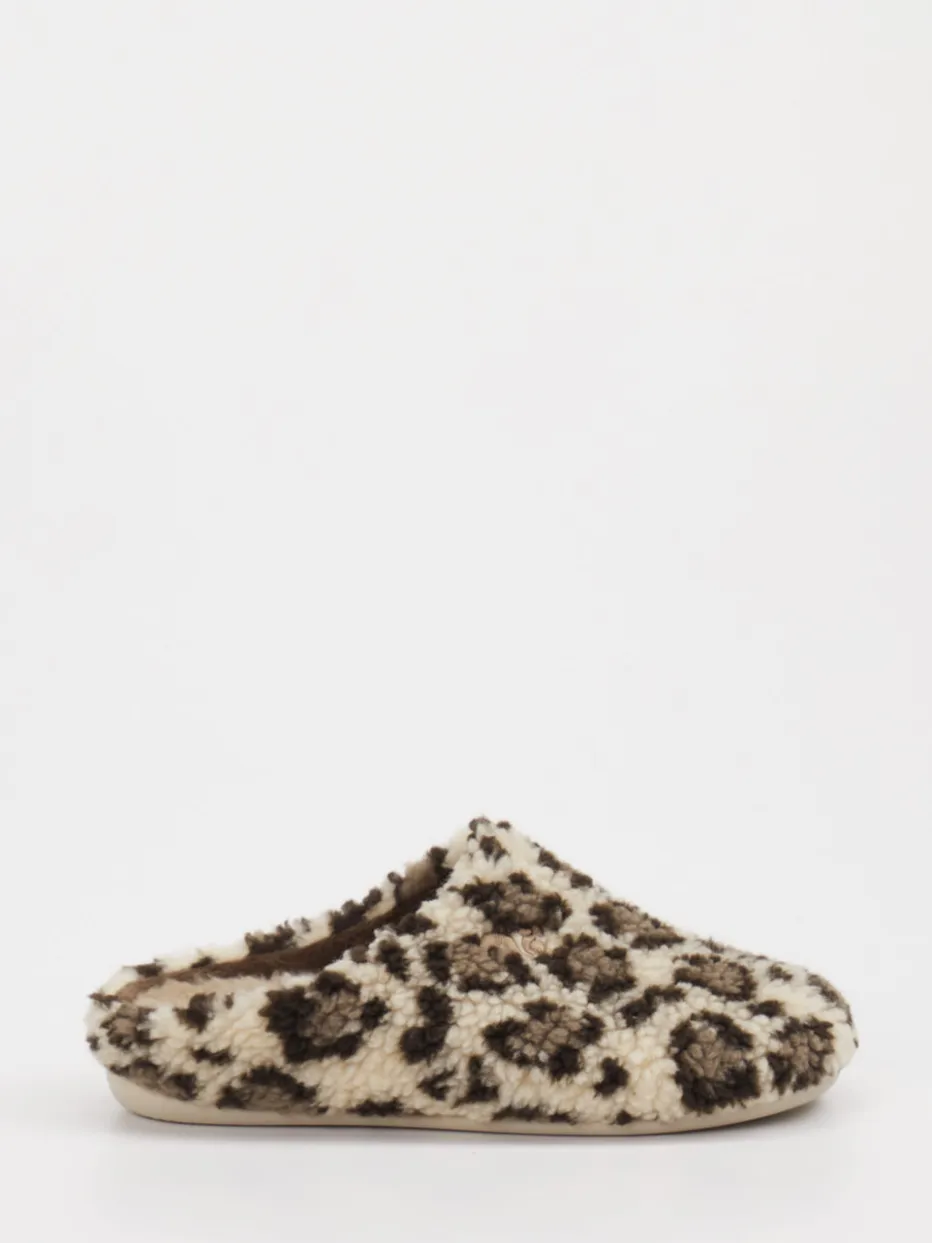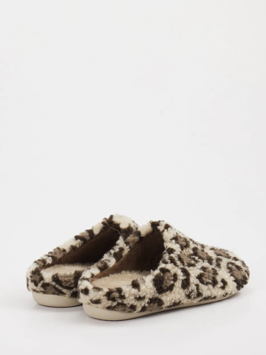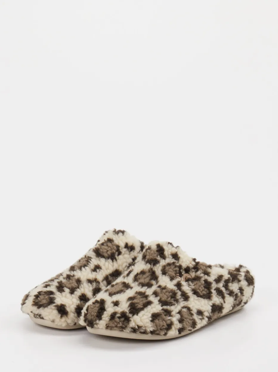 Gemütlicher Leoparden-Look für zuhause. Die Marke Thies präsentiert mit diesen offenen Pantoffeln stilvolle Damen-Hausschuhe für entspannte Stunden. Der flauschige Textilbezug in cremeweißer Leoprint-Optik verbindet modischen Ausdruck mit behaglichem Tragegefühl. Der geschlossene Vorderbereich sorgt für Wärme, während der offene Fersenbereich das einfache Hineinschlüpfen unterstützt. Die griffig profilierte Gummisohle bietet zuverlässigen Halt auf glatten Böden. Inspiriert von Cozy Homewear und Loungewear-Trends, sind diese Pantoffeln eine stilvolle Wahl für kalte Tage. Perfekt zu lässigen Hausanzügen oder flauschigen Decken kombinierbar. Ein leichter Lieblingsschuh mit modischem Tiermuster und komfortorientierter Formgebung.