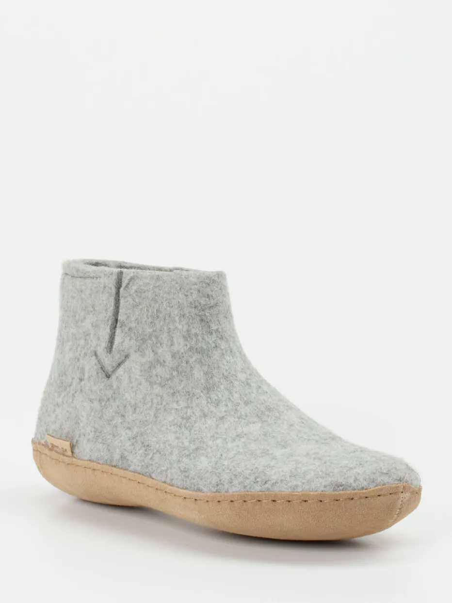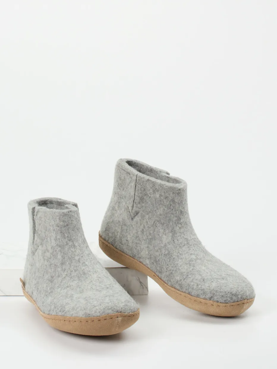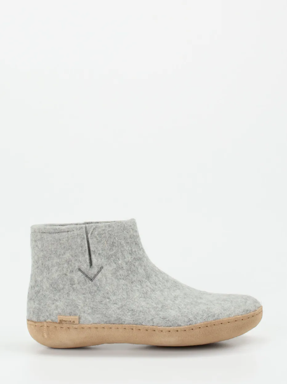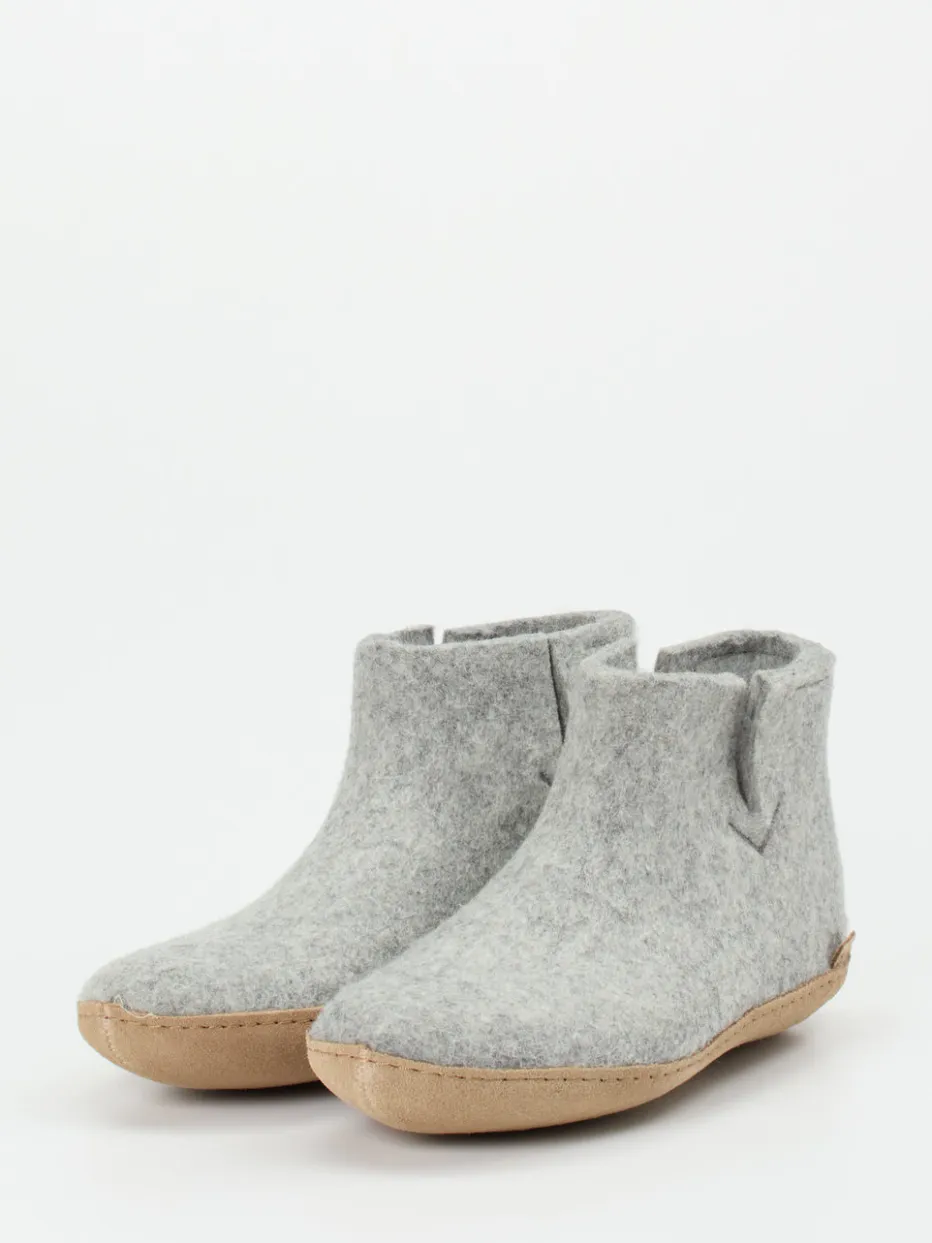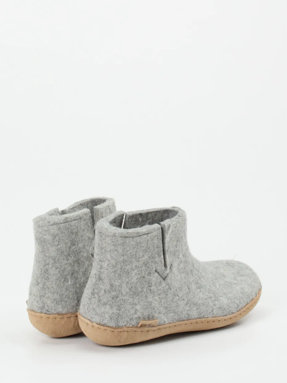 Filzkomfort im skandinavischen Design.Glerups präsentiert mit diesen Hausschuhen ein Unisex-Modell in bootieartiger Form, ideal für entspannte Stunden daheim. Der knöchelhohe Einstieg aus hellgrauem, atmungsaktivem Wollfilz schmiegt sich angenehm an den Fuß und spendet gleichmäßige Wärme. Die leicht strukturierte Oberfläche wirkt dabei ebenso gemütlich wie charaktervoll. Eine rutschfeste, naturfarbene Ledersohle sorgt für Trittsicherheit auf glatten Böden. Sichtbare Nähte, eine dezente V-Ziernaht und das minimalistisch eingefasste Design greifen den aktuellen Scandi-Trend harmonisch auf. Die Kombination aus Loungewear-Funktionalität und zeitlosem Stil passt hervorragend zu Leggings oder Strickhosen. Ein authentisches Wohlfühlprodukt mit dänischem Qualitätsanspruch.