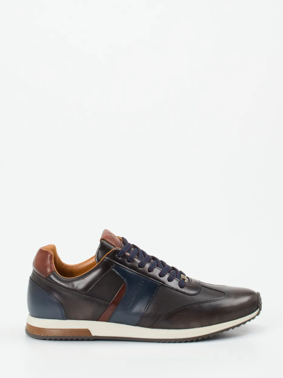 Retro trifft smarte Eleganz.Ambitious präsentiert stilvolle Herren-Sneaker im klassischen Low-Top-Design. Ideal für Casual-Fridays oder stilvolle Wochenendlooks: Der Materialmix aus hochwertigem Kalbleder und textilen Partien überzeugt durch eine glänzende Oberfläche und strukturierte Farbkontraste in Navyblau und Cognacbraun. Die klassische, schmale Silhouette wird durch zweifarbige Schnürsenkel mit Metall-Detail ergänzt. Eine profilierte Gummisohle mit Zickzackmuster und ein gepolsterter Schaftrand sorgen für Komfort im Alltag. Designinspirierte Elemente aus Retro Running und aktuelle Color-Blocking-Trends machen den Look zeitgemäß. Vielseitig kombinierbar zu Denim oder Wollhose. Ein hochwertiger Urban-Sneaker mit modischem Anspruch und eleganter Verlässlichkeit.