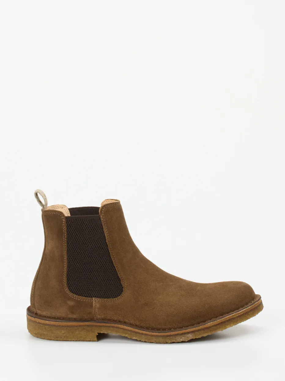Reduktives Design mit Charakter.Astorflex präsentiert klassisch geschnittene Chelsea Boots für Herren. Ein Begleiter für Tage, an denen Komfort, Stil und Understatement zählen: Das mittelbraune Veloursleder wirkt dank matter Oberfläche dezent natürlich und weich. Die seitlichen Elasteinsätze in Kontrastfarbe und die textile Zuglasche sorgen für einen praktischen, zugleich charmanten Einstieg. Das Innenfutter aus Kalbleder trägt sich angenehm am Fuß. Die dicke Kreppsohle mit honigfarbener Struktur fügt sich harmonisch ins Design ein. Ruhige Farbgebung und klassische Formensprache machen das Modell kombinationsstark zu Business Casual, Heritage- oder Naturtönen im Herbst. Zeitloser Komfort mit italienischer Designkultur.