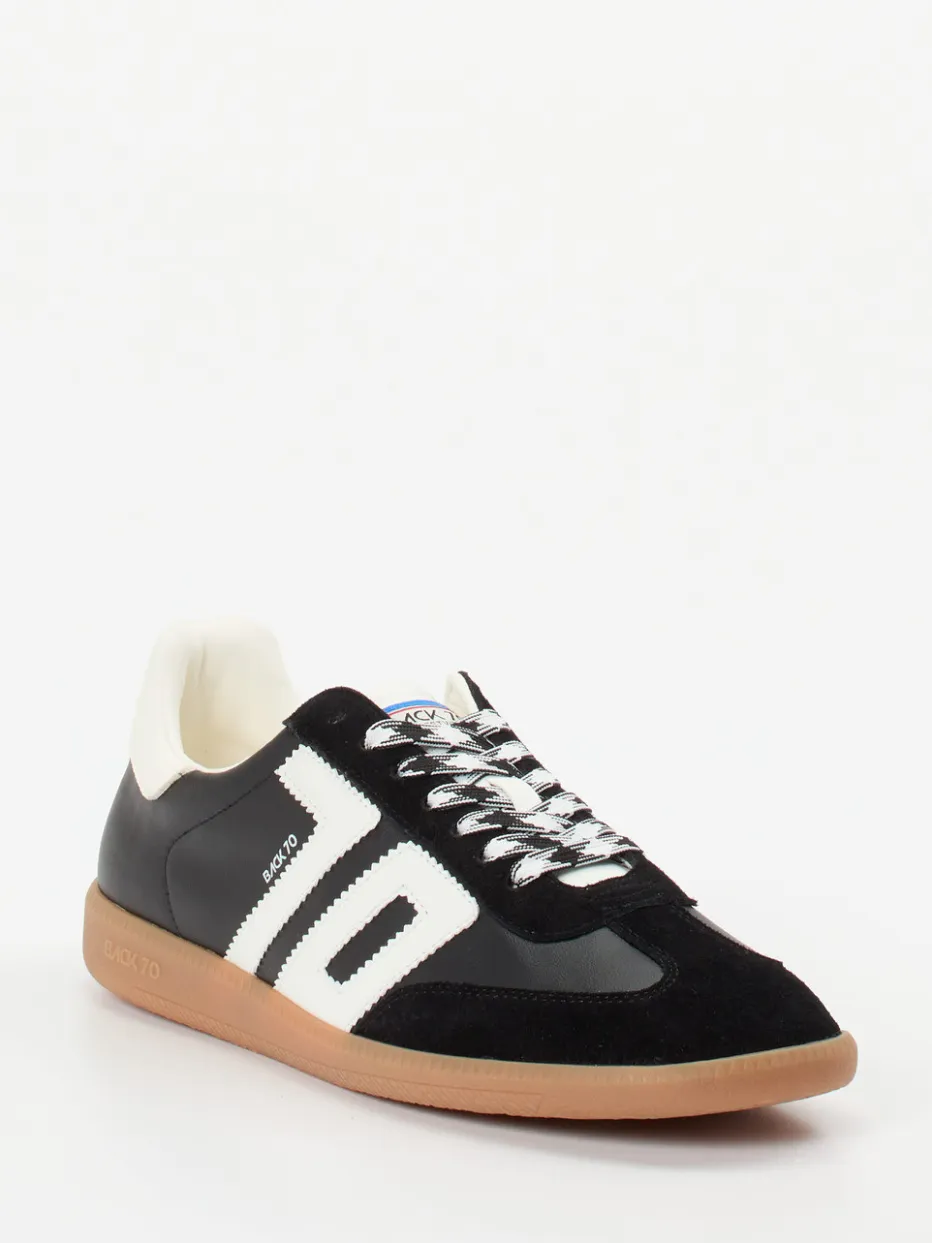 Kontrast, Komfort und Stil der 90er.Back 70 interpretiert den klassischen Retro-Sneaker neu. Perfekt für entspannte City-Tage überzeugt das Modell mit einem hochwertigen Mix aus glattem Leder und samtig angeschliffenem Veloursleder. Die dominante schwarze Farbgebung wird durch weiße Logos und gummibraune Akzente an der Sohle kontrastiert. Zweifarbige Schnürsenkel, eine gepolsterte Ferse und eine griffig profilierte Gumsohle unterstreichen den sportiven Vintage-Charakter, während das Frotteefutter den Tragekomfort erhöht. Ein echtes Highlight für trendbewusste Streetwear-Looks. Markentypischer Materialmix trifft auf retroinspiriertes Design und moderne Alltagstauglichkeit.