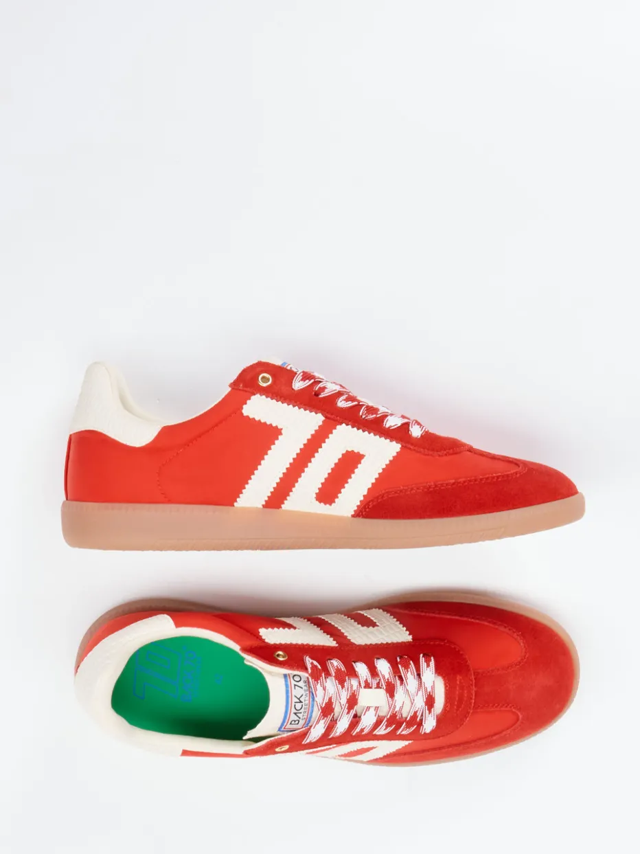 Statement-Sneaker für stilbewusste Streetlooks.Back 70 präsentiert mit diesem Retro-Sneaker ein Unisex-Modell, das sportlichen Zeitgeist mit Nostalgie vereint. Ideal für urbane Freizeitmomente überzeugt dieser Sneaker durch ein Obermaterial aus atmungsaktivem Meshtextil, das mit samtigem Veloursleder akzentuiert ist. Kräftiges Signalrot prägt den markanten Color-Blocking-Look, während goldfarbene Ösen, ein Zickzack-Seitenstreifen und der Label-Patch auf der Zunge den Vintage-Charme unterstreichen. Die flache Silhouette, die flexible honigfarbene Gummisohle sowie die gepolsterte Innenverarbeitung sorgen für hohen Tragekomfort. Elemente wie die zweifarbigen Schnürsenkel und die geprägte Fersenpartie setzen zusätzliche Designreize. Ein Favorit für trendbewusste Looks mit retro-inspirierter Lässigkeit. Markencharakter und 90s-Flair in einer modernen Streetwear-Silhouette.