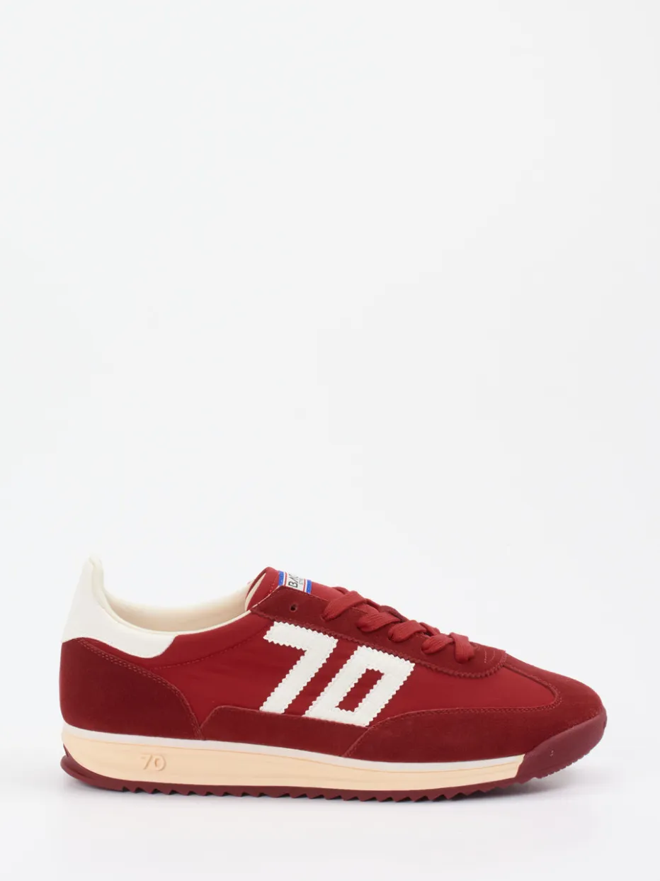 70er-Flair trifft modernen Streetstyle.Back 70 präsentiert einen trendstarken Sneaker im Stil klassischer Retro-Runners. Ideal für entspannte Freizeitmomente oder sportliche City-Looks: Der flache Schuh kombiniert weinrotes Textil mit samtig strukturiertem Veloursleder und cremefarbenen Kontrastakzenten. Eine profilierte Gummisohle sorgt für guten Halt, das Logo-Label auf der Zunge und das plakative „70“-Branding unterstreichen die Vintage-Ästhetik. Der Unisex-Sneaker eignet sich für trendorientierte Casual-Outfits und überzeugt durch seinen klaren Bezug zum Retro-Sneaker-Trend SS24. Passend zu Retro-Sportjacken oder Canvas-Rucksäcken. Komfortabler Everyday-Sneaker mit authentischer 70er-Jahre-Note.