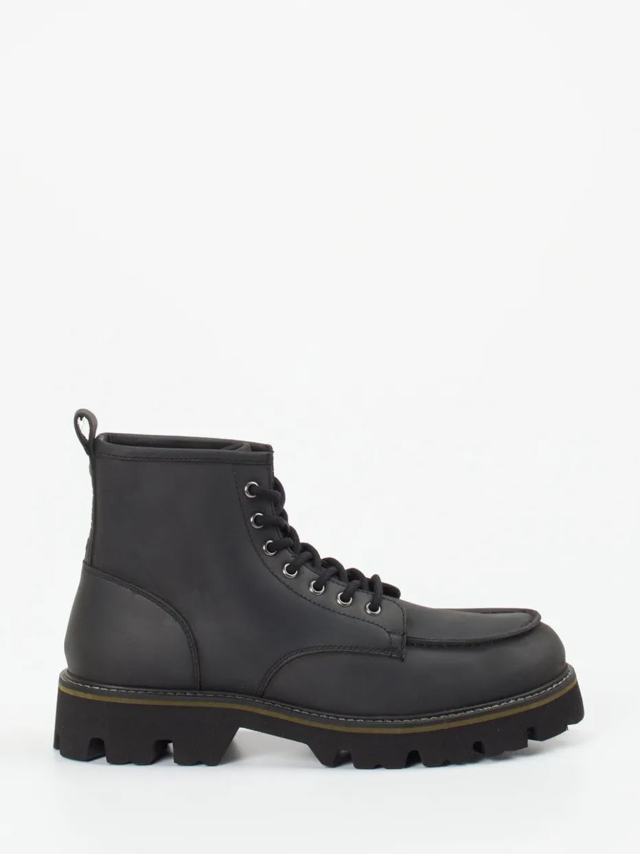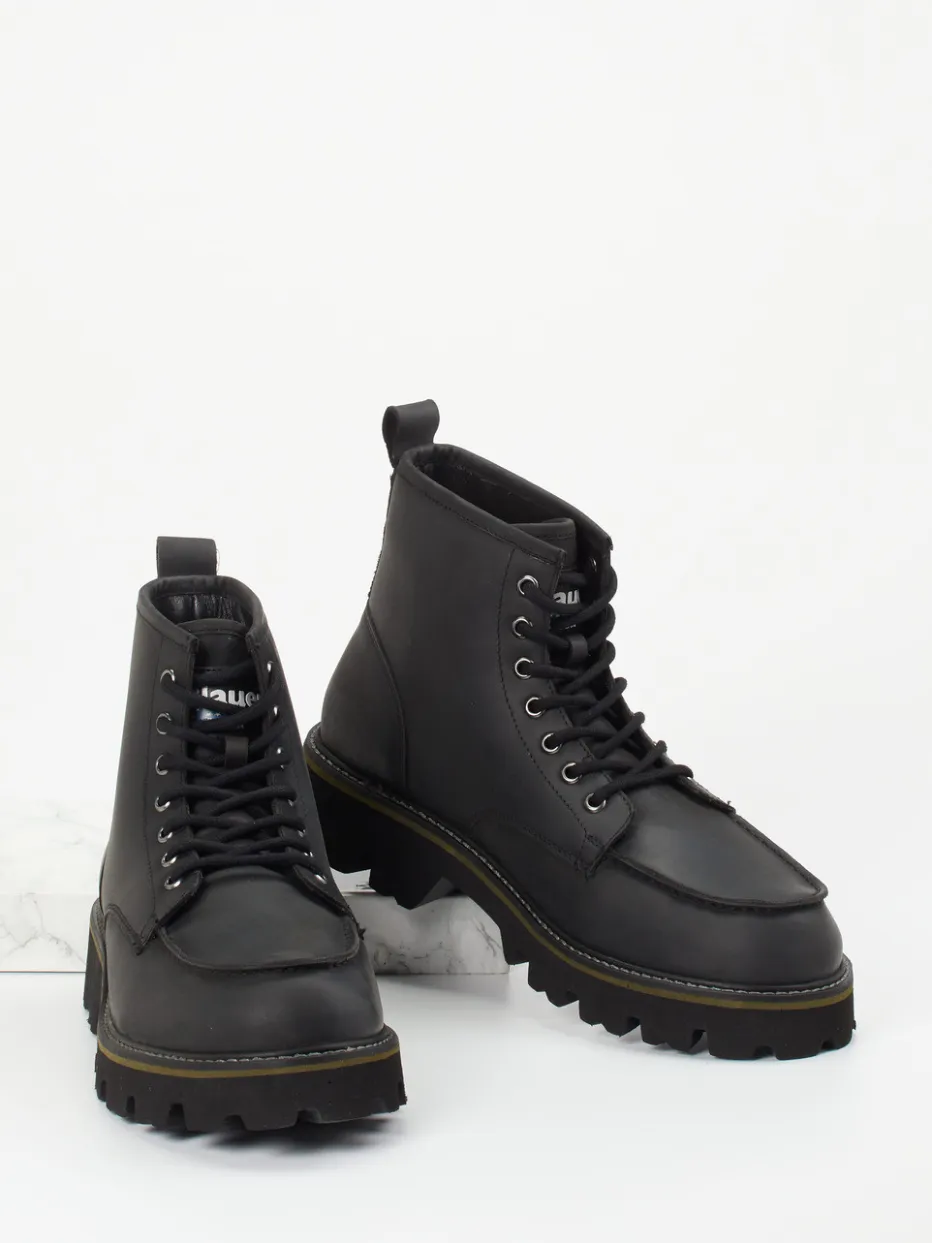 Workwear-Flair trifft auf urbanen Komfort.Blauer präsentiert markante Schnürboots für die Herbst- und Wintersaison. Diese Modelle sprechen alle an, die zuverlässigen Halt und starken Stil für Alltag und Freizeit suchen. Gefertigt aus strapazierfähigem Kalbleder mit matter Oberfläche, überzeugt das robuste Obermaterial durch Langlebigkeit und klare Linien. Die schwarze Farbgebung wirkt zeitlos, während Gelb-Oliv-Kontrastnähte und Metallösen dezente Akzente setzen. Eine profilierte Chunky-Sohle aus Gummi sorgt für Trittsicherheit und passt in Workwear- wie Streetstyle-Umgebungen. Innen garantieren Leder und Textil angenehmen Tragekomfort. Kombinierbar zu Denim, Overshirts oder Outdoorjacken. Ein alltagstauglicher Begleiter mit konsequentem Stil und funktionalem Mehrwert.