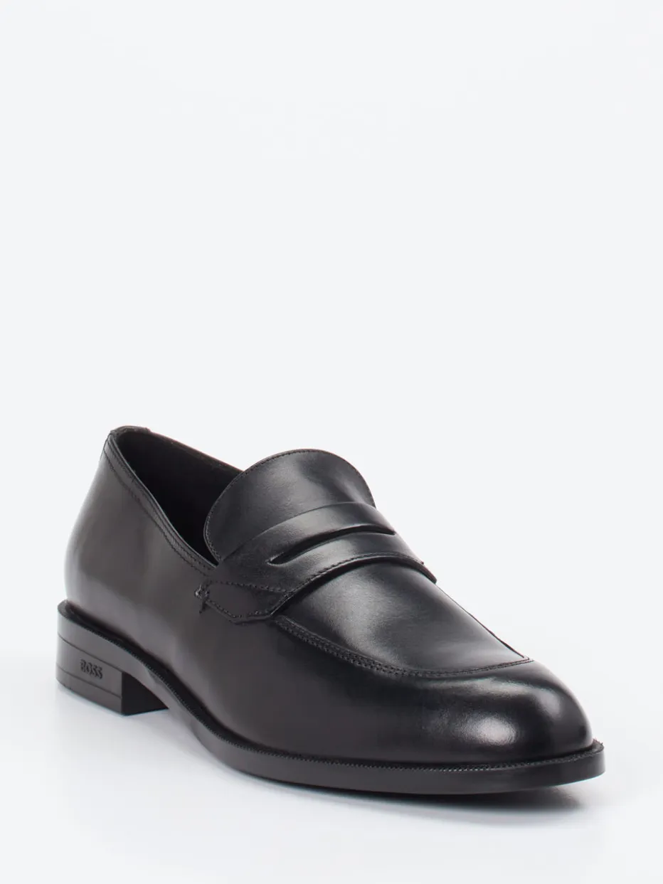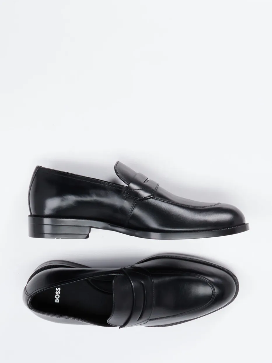 Klassik trifft dezente Moderne.Die Marke Boss präsentiert mit diesem schwarzen Herren-Loafer ein hochwertiges Modell für elegante Anlässe und seriöse Office-Looks. Für den Business-Alltag konzipiert, überzeugt der Schlupfschuh mit edlem Kalbleder, das leicht matt glänzt. Charakteristische Mokassinnähte, eine offenkantige Bride im Penny-Stil und die schlanke Form unterstreichen den zeitlosen Stil. Die leicht profilierte Gummisohle bietet Rutschschutz und unterstützt den durchdachten Komfort mit weichem Innenfutter. Ton-in-Ton-Nähte und eine seitliche Logoprägung perfektionieren die minimalistische Ausstrahlung. Der Look fügt sich harmonisch in den Trend „Quiet Luxury“ ein. Stilvoller Auftritt mit souveränem Charakter – markentypisch Boss.