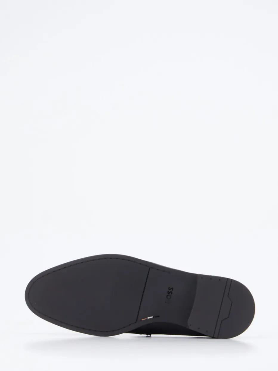 Dieser Herren-Loafer von Boss kombiniert matt glänzendes Kalbleder mit klassischem Design und dezenter Logoprägung – ideal für formelle Auftritte mit stilvollem Understatement.