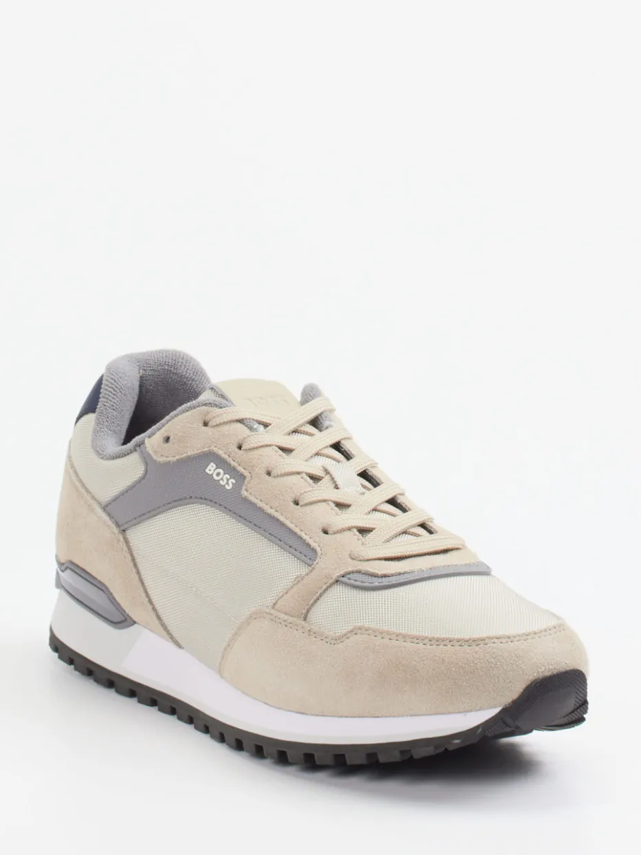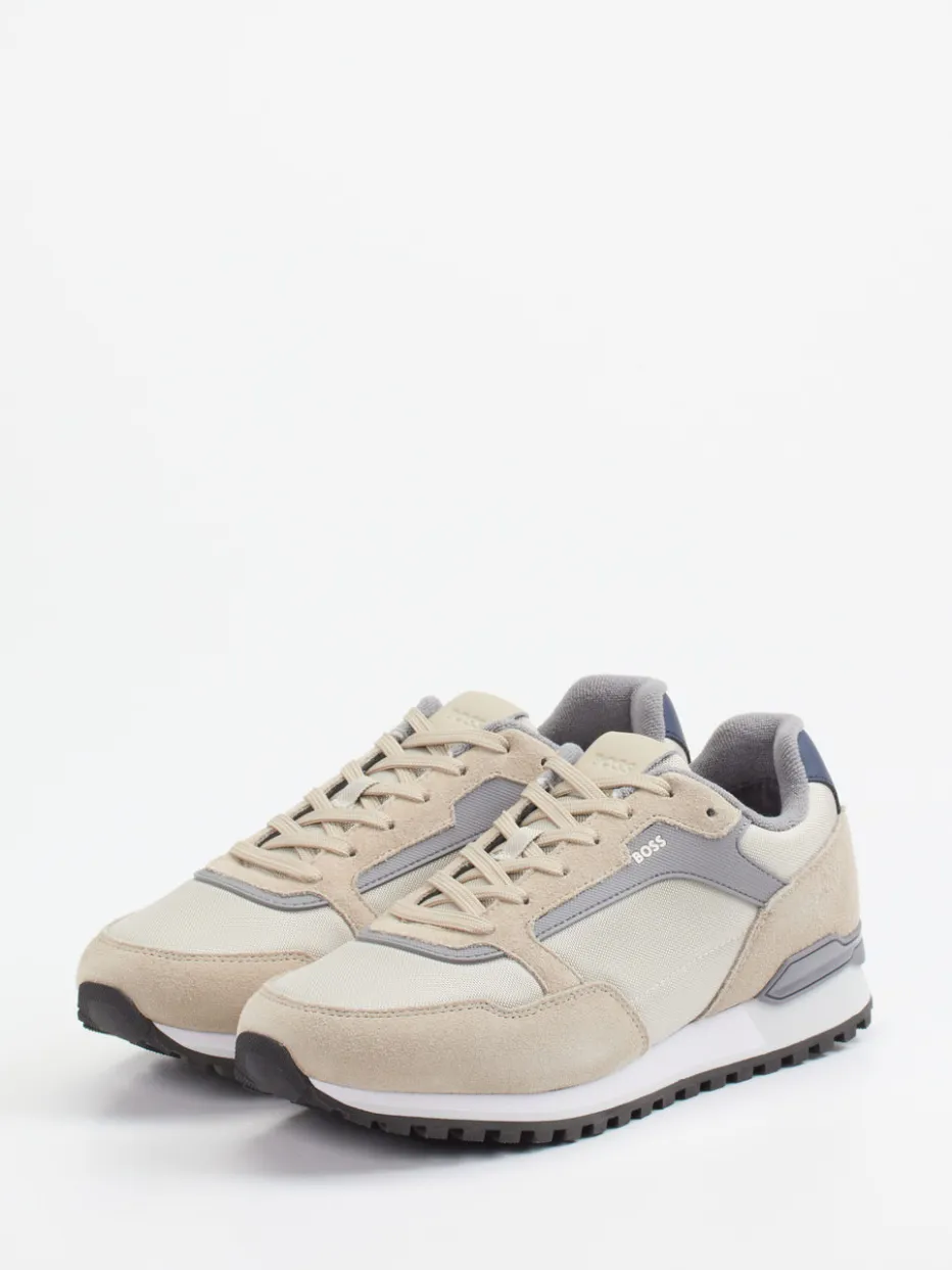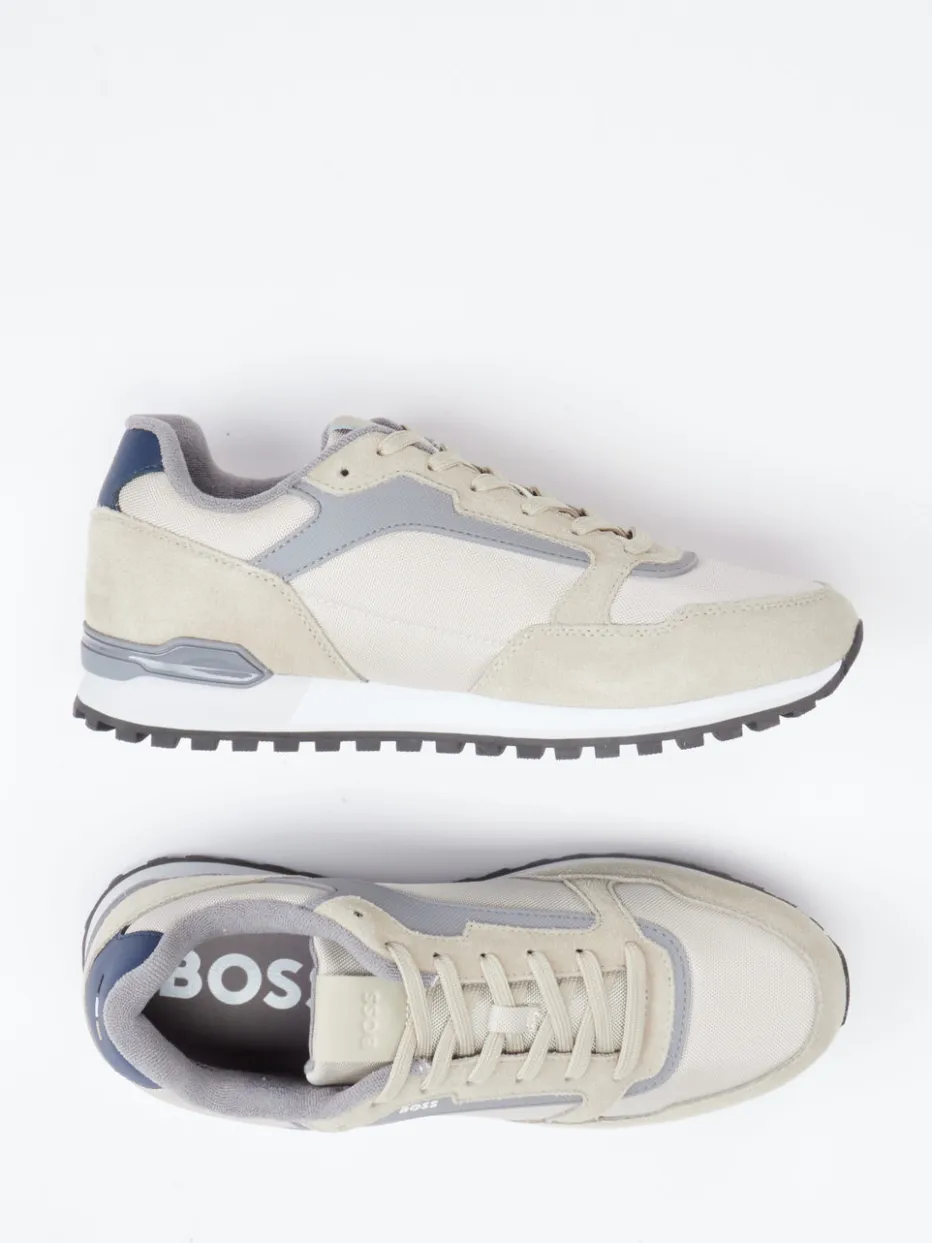 Retro-Design trifft auf modernen Komfort.Der Herren-Sneaker von Boss bringt klassische Runner-Flair in die Gegenwart. Für entspannte City-Walks oder einen sportlich inspirierten Tageslook überzeugt das Modell mit einem anspruchsvollen Mix aus Velour und Textil. Die kombiniert glatte und leicht genarbte Oberfläche sorgt zusammen mit tonalen Overlays in Beige sowie Akzenten in Grau und Dunkelblau für dezente Tiefe. Gepolsterter Schaft, profilierte Gummisohle und Schnürung garantieren Alltagstauglichkeit mit Komfort. Die Prägung auf Zunge und Seite ergänzt das ruhige Design authentisch. Ein vielseitiger Sneaker mit Sinn für reduzierte Ästhetik und hochwertige Verarbeitung.