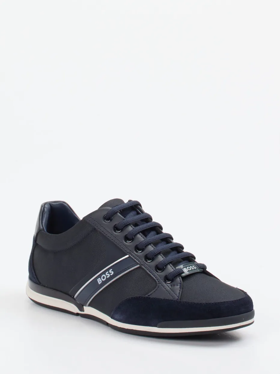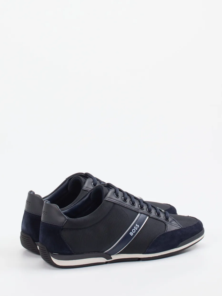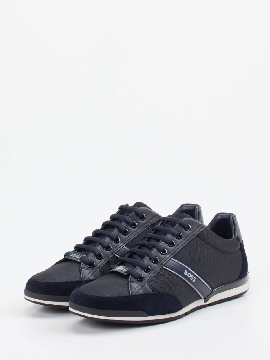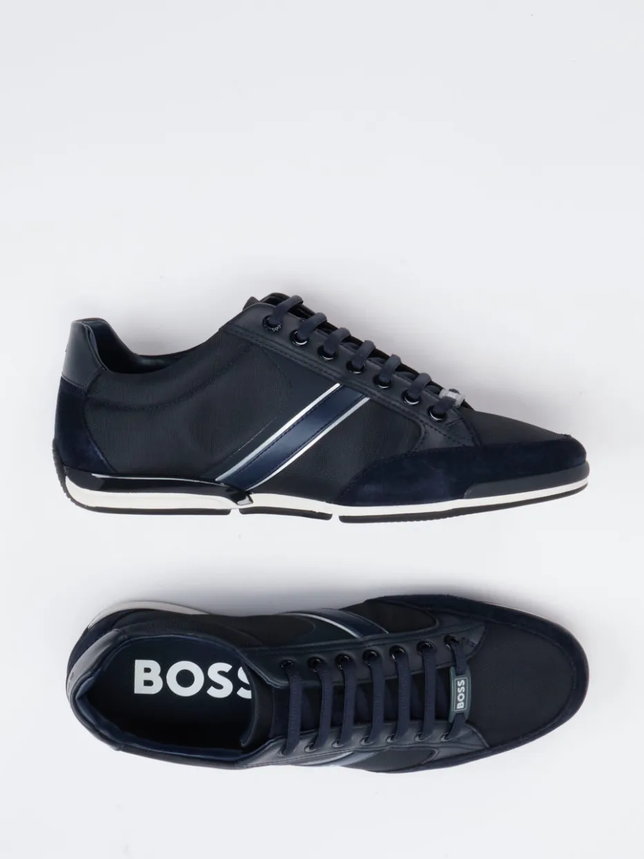 Urbaner Minimalismus trifft auf Markenästhetik.Der Herren-Sneaker von Boss verbindet klassische Linien mit modernen Streetwear-Elementen. Für gepflegte Casual-Looks oder einen souveränen Büroauftritt überzeugt das Modell durch navyblaues Kalbleder, kombiniert mit samtig angeschliffenen Veloursleder-Details und strukturiertem Textilfutter. Die kontrastreiche Optik wird von glänzenden Streifen und Logo-Applikationen akzentuiert. Eine profilierte Gummisohle sorgt für sicheren Tritt, während das herausnehmbare, weich gepolsterte Fußbett Komfort auf Dauer garantiert. Der Look ist minimalistisch gehalten – ein klarer Verweis auf den Trend „Quiet Luxury“. Stilvielfalt, gepaart mit typischer Boss-Raffinesse im Design.