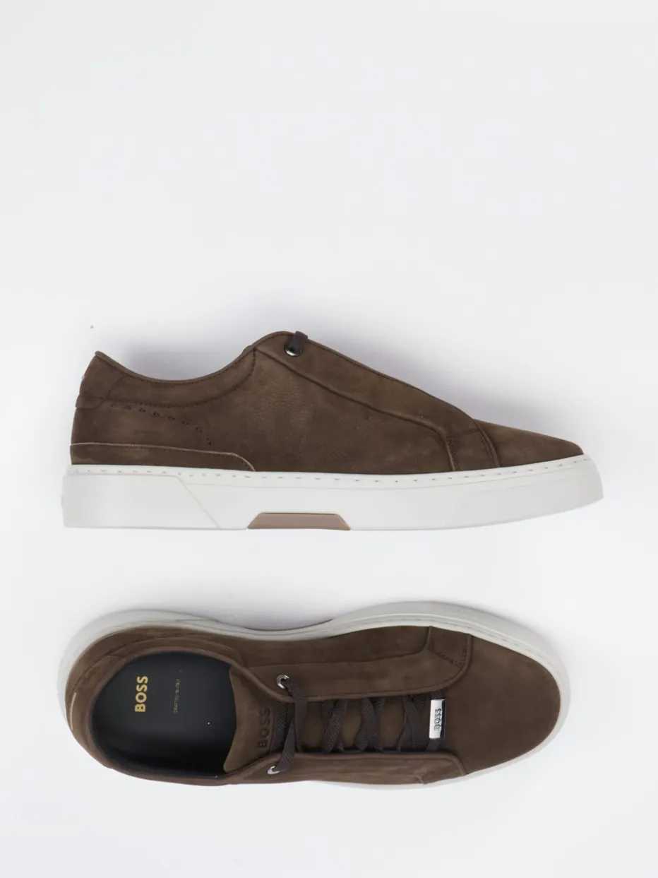 Schlichte Eleganz für moderne Looks. Boss präsentiert diesen Herren-Sneaker in klassischer Low-Top-Form. Perfekt für urbane Casual-Settings oder ein smartes Office-Styling: Das Modell aus Nubukleder wirkt dank matter Oberfläche und tonaler Verarbeitung besonders edel. Ein gepolsterter Rand und Innenfutter aus warmer Textilfaser garantieren Komfort auch an kühleren Tagen. Die dezente Logo-Prägung an Ferse und Zunge sowie metallische Akzente an der Schnürpartie unterstreichen den minimalistischen Designansatz. Die Offwhite-Gummisohle sorgt für feinen Kontrast und sicheres Auftreten. Optimal kombinierbar zu monochromen Looks oder dunklem Denim. Stilvolle Zurückhaltung vereint mit typischer Boss-Präzision.