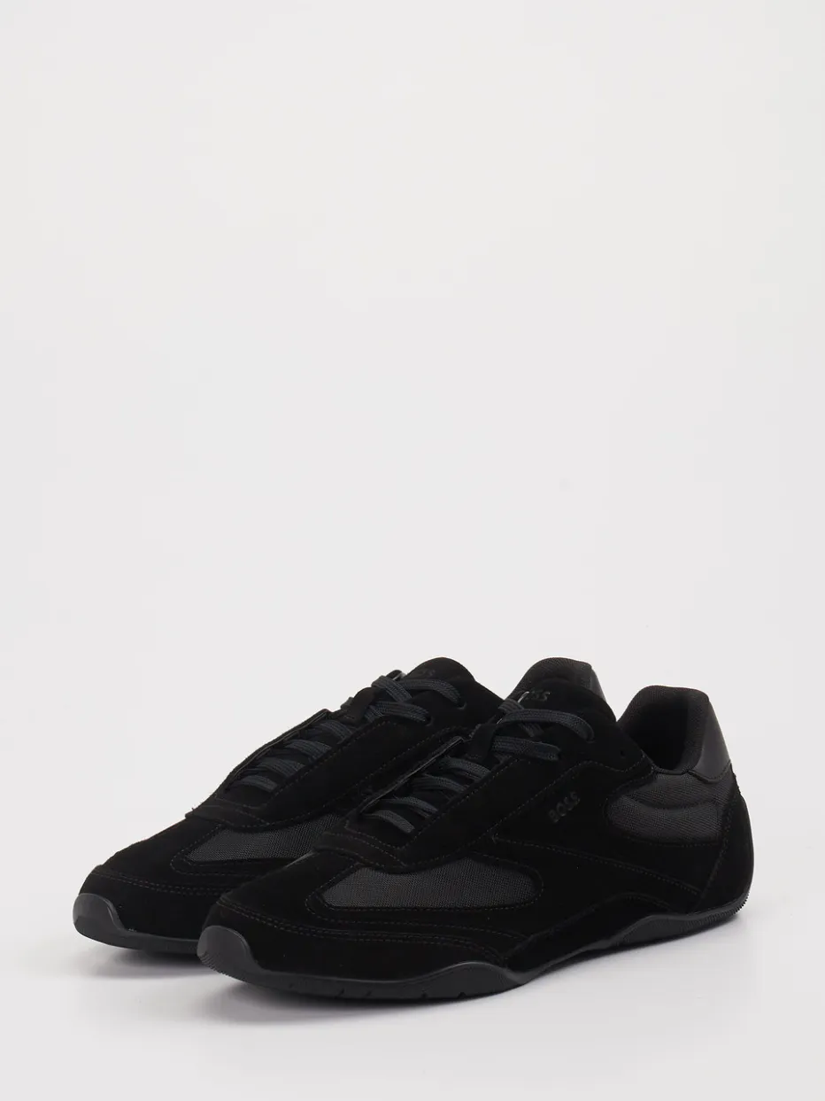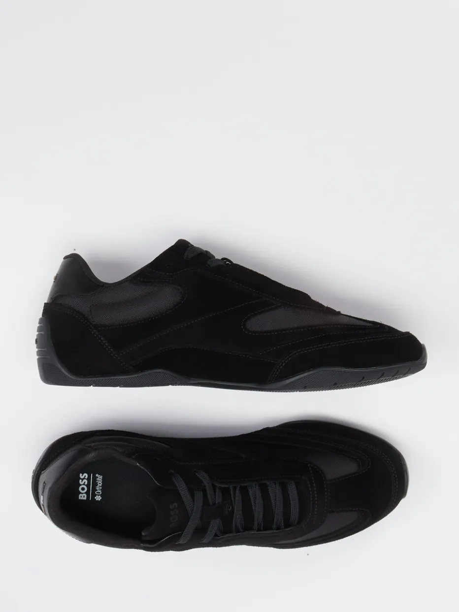 Monochromes Understatement für urbane Looks. Boss präsentiert mit diesem Low-Top-Sneaker ein Modell, das sportliche Eleganz und Funktionalität vereint. Ideal für den Alltag in der Stadt: Das Obermaterial aus Velour und Mesh sorgt für eine harmonische Mischung aus weicher Haptik und Atmungsaktivität. In sattem Schwarz gehalten und mit Ton-in-Ton-Nähten sowie dezentem Branding versehen, wirkt der Sneaker modern und schnörkellos. Die flache, leicht zulaufende Silhouette erinnert an Retro-Runner und profitiert von einer griffig profilierten Gummisohle. Ob zur Jogpants oder zur schmalen Jeans – perfekt für minimalistische Streetwear-Looks. Ein modischer Freizeitschuh mit leiser Luxusnote – präzise im Stil von Boss.
