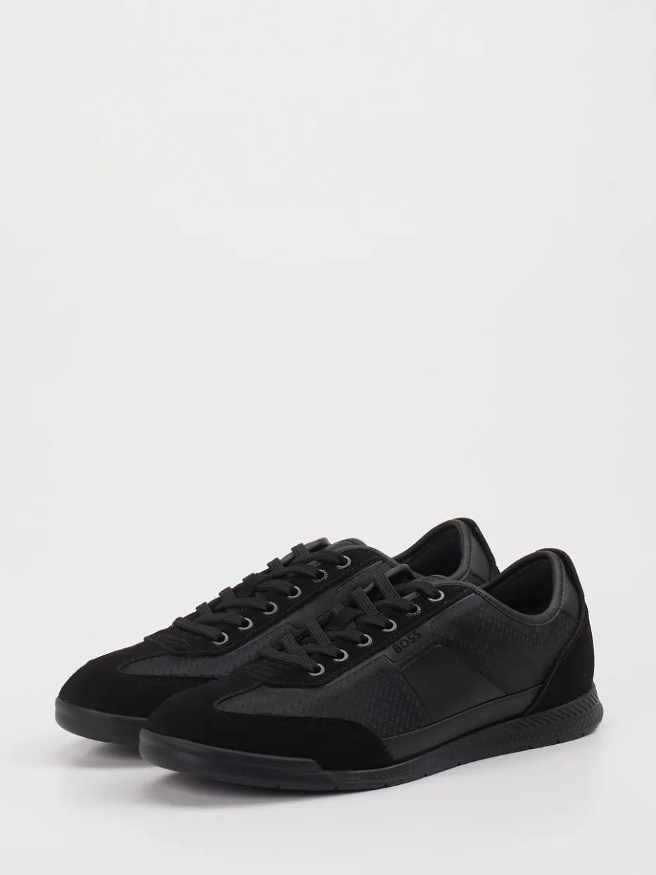 Minimalistische Raffinesse in monochromem Design. Dieser Herren-Sneaker von Boss verbindet Eleganz mit urbaner Lässigkeit. Ideal für den smarten Alltag oder das Büro: Das Modell setzt auf eine Kombination aus Veloursleder und Textil, ergänzt durch glatte und strukturierte Partien. Das tiefschwarze Ton-in-Ton-Design, dezentes seitliches Branding und eine schlanke Silhouette unterstreichen den klaren Look. Eine profilierte Gummisohle sorgt für Halt, während Metallösen an der Schnürung den Premium-Charakter betonen. Stilistisch bewegt sich der Sneaker zwischen „Quiet Luxury“ und cleanem Streetwear-Appeal – vielseitig kombinierbar zu Casual Pants oder Business-Anzügen. Bietet souveräne Zurückhaltung mit der markentypischen Ästhetik von Boss.
