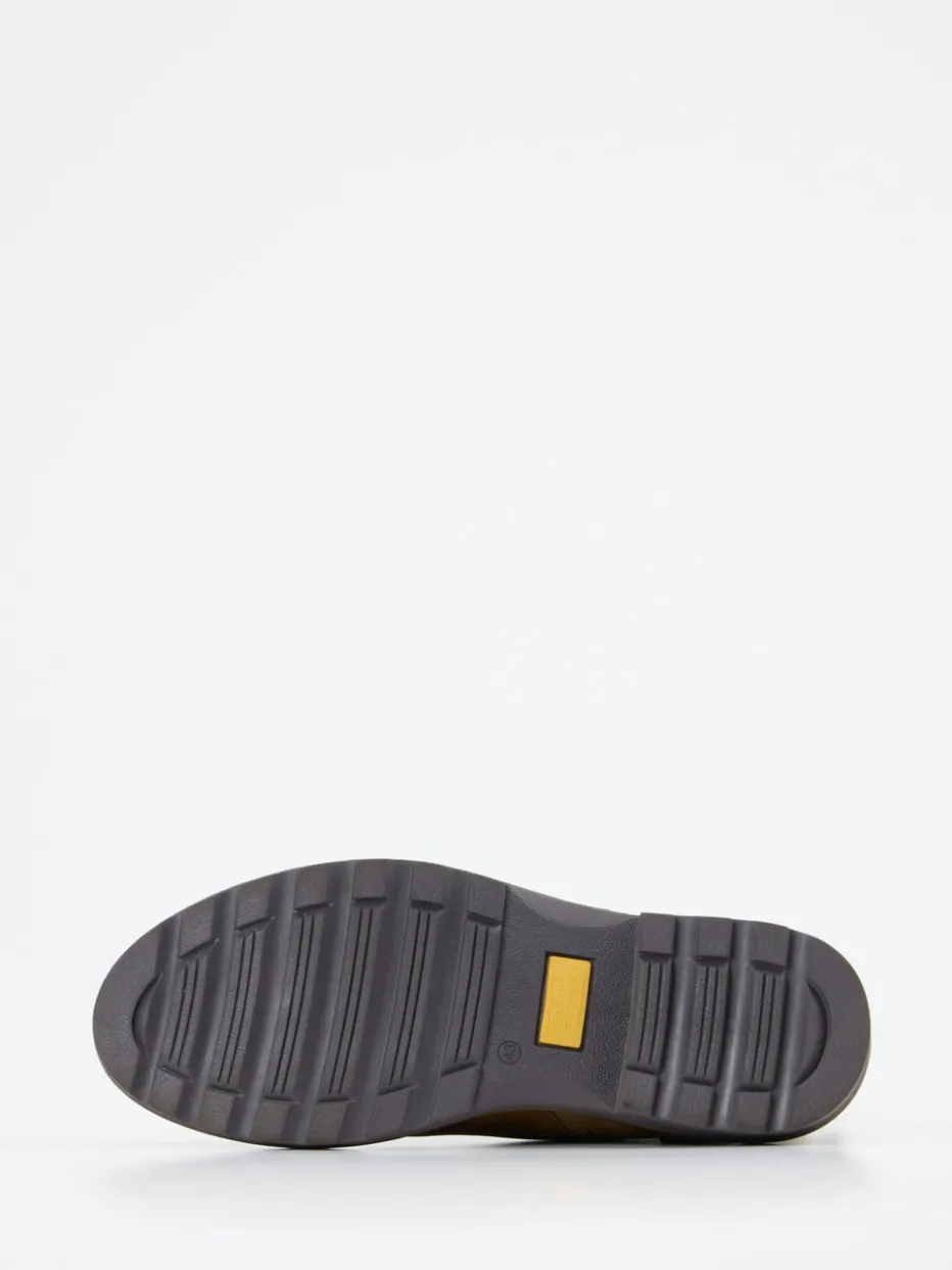 Robustes Nubukleder mit samtiger Oberfläche trifft auf eine profilierte Gummisohle – ein funktionaler Begleiter für Alltag und Outdoor mit dezenter Utility-Ästhetik.