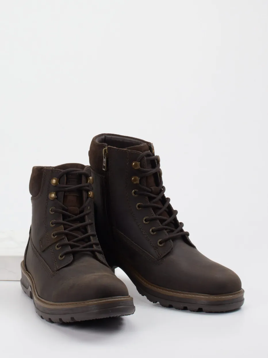 Diese robusten Herrenboots vereinen mattes Fettleder mit tiefer Profilsohle und messingfarbenen Ösen für einen markanten Utility-Look. Perfekt für herbstliche Freizeitaktivitäten.