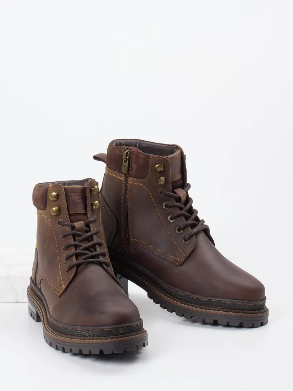 Outdoor-Stil mit funktionalem Anspruch.Camel Active präsentiert kernige Herren-Schnürboots in dunkelbraunem Fettleder. Ideal für wechselhafte Herbsttage oder ausgedehnte Freizeitspaziergänge, überzeugen diese knöchelhohen Boots durch die Kombination aus strapazierfähigem Leder mit matter Oberfläche, seitlichem Reißverschluss und einer robusten Profilgummisohle. Messingfarbene Ösen, Haken und auffällige gelbe Kontrastnähte setzen markante Akzente im Workwear-Stil. Die wollgefütterte Innenseite und die gut gepolsterte Schaftpartie sorgen für angenehmen Tragekomfort – auch an kühlen Tagen. Ein zuverlässiger Begleiter im Utility-Trend mit alltagstauglichem Designanspruch.