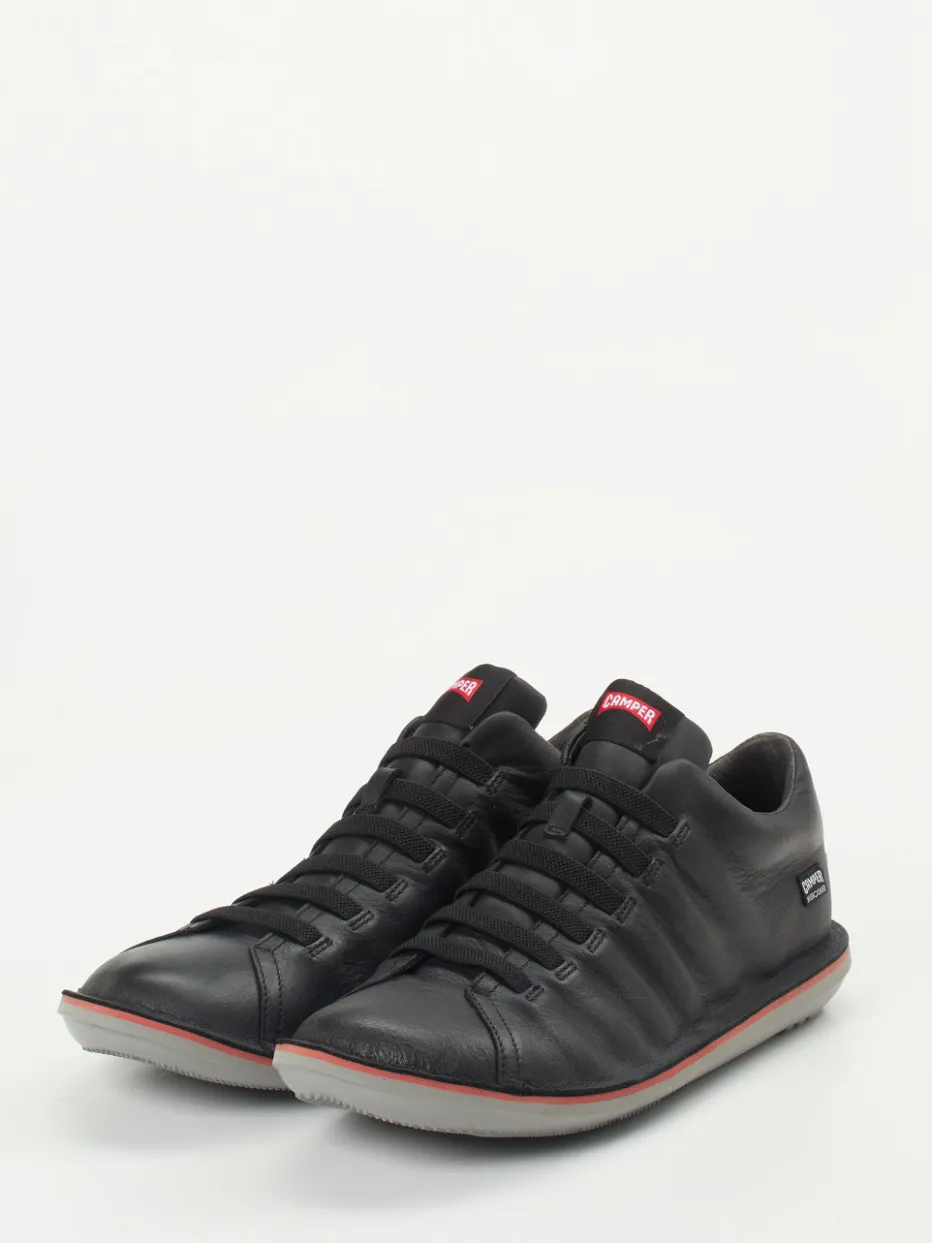 Minimalistischer Komfort für jeden Tag.Camper präsentiert mit diesem Sneaker einen urban ausgerichteten Herren-Low-Top aus schwarzem Kalbleder. Die matte Lederoberfläche zeigt sich wasserabweisend dank HydroShield-Veredelung. Die ergonomisch geformte Gummisohle mit noppenartigem Profil bietet optimale Dämpfung beim Gehen, während sechs elastische Riemen das Anziehen erleichtern und sicheren Halt gewährleisten. Rote Akzente an der Sohle sowie farblich abgestimmte Logos unterstreichen den klaren Streetwear-Look. Innen absorbiert atmungsaktives Textil effektiv Feuchtigkeit – ideal für citytaugliche Bewegungsfreiheit. Kombiniert zu Funktionsjacke und Rucksack wirkt der Look besonders authentisch. Ein durchdachtes Design für komfortbetonte Urbanwear mit markentypischer Innovationskraft.
