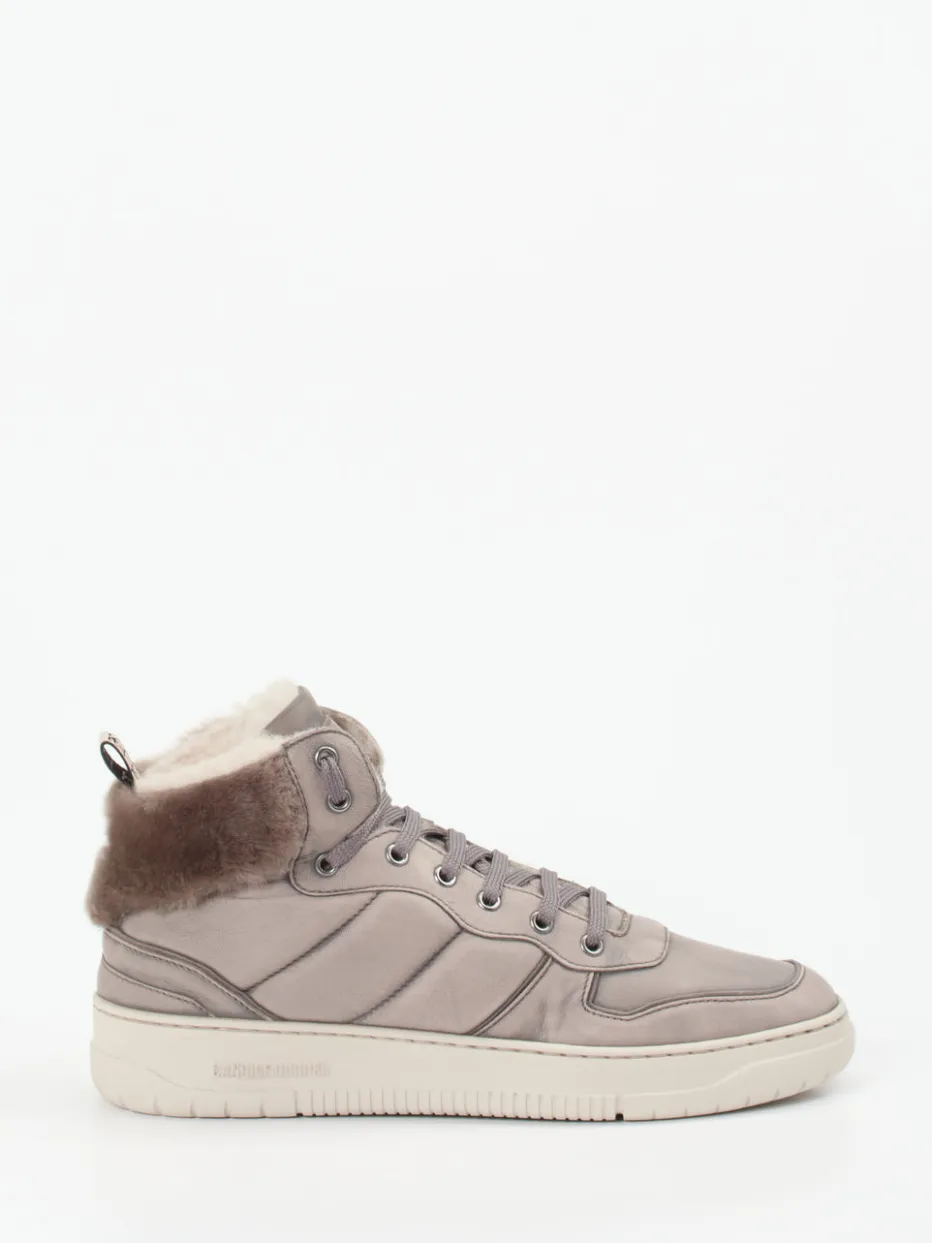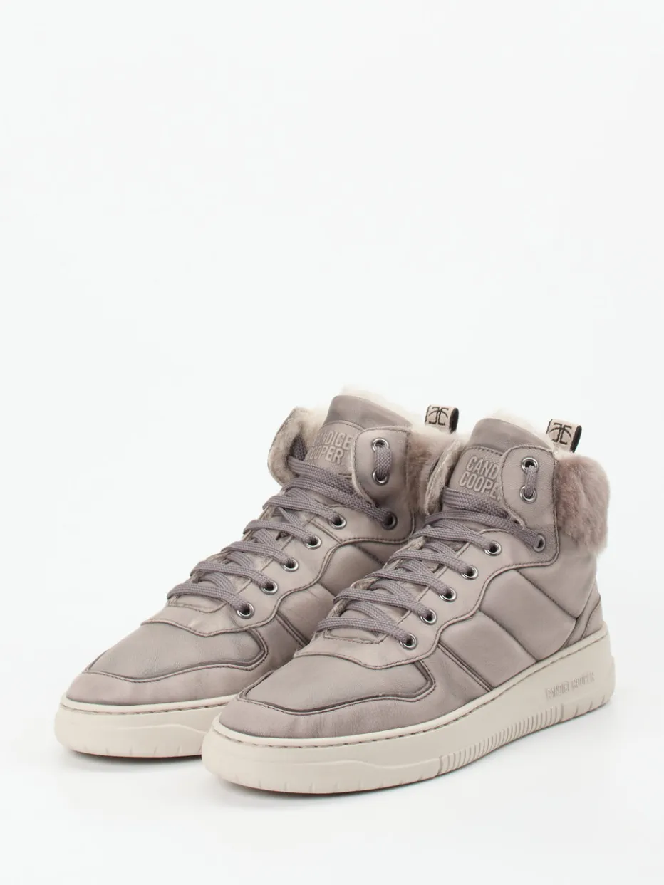 Winterkomfort mit puristischem Design.Candice Cooper präsentiert mit diesem High-Top Sneaker ein formschönes Modell für die kalte Jahreszeit. Der graue Lammlederschuh überzeugt mit matt strukturierter Oberfläche, tonaler Schnürung und Fersenlasche mit Logo. Innen sorgt ein kuscheliges Wollfutter für angenehme Wärme. Die profilierte Gummisohle liefert Stabilität, während das austauschbare Fußbett den Komfort erhöht. Der urbane Look mit seiner klaren Silhouette und minimalistischen Details passt ideal zu Streetwear-inspirierten Winteroutfits. Besonders stimmig zu Steppjacke und Kaschmir-Mütze kombinierbar. Ein Winterschuh mit funktionalem Designfokus und hochwertiger Verarbeitung – typisch Candice Cooper.