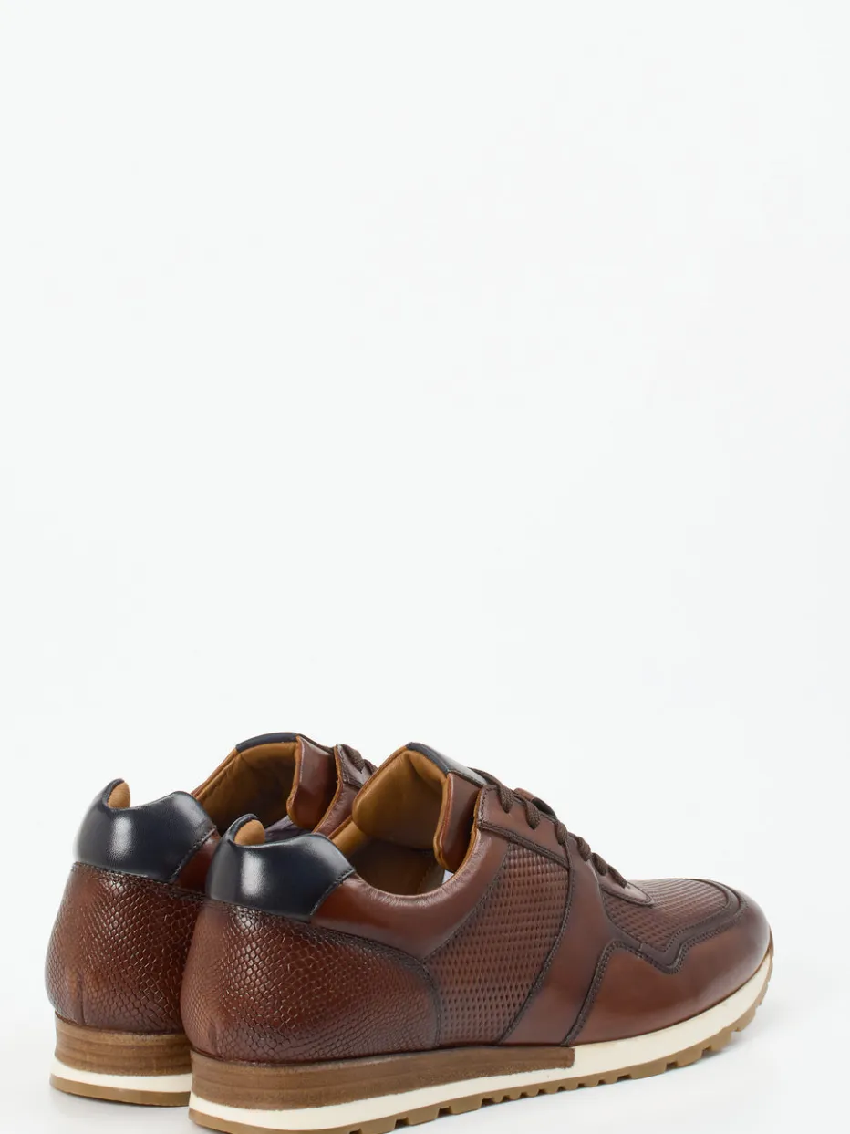 Die Kombination aus glattem und strukturiert geprägtem Kalbleder in Mittelbraun trifft auf akzentuierende Details wie den dunkelblauen Fersenbesatz und perforierte Partien. Die klassisch-schlanke Silhouette mit robuster Schnürung sitzt komfortabel dank gepolstertem Einstieg und flexiblem Leder-/Textilfutter. Die mehrlagige Gummisohle begeistert mit Profilierung und weißem Zwischenelement im Heritage-Stil. Ideal für klassisch orientierte Männer, die Qualität und dezente Eleganz suchen. Harmoniert mit Chino oder Jeans gleichermaßen.