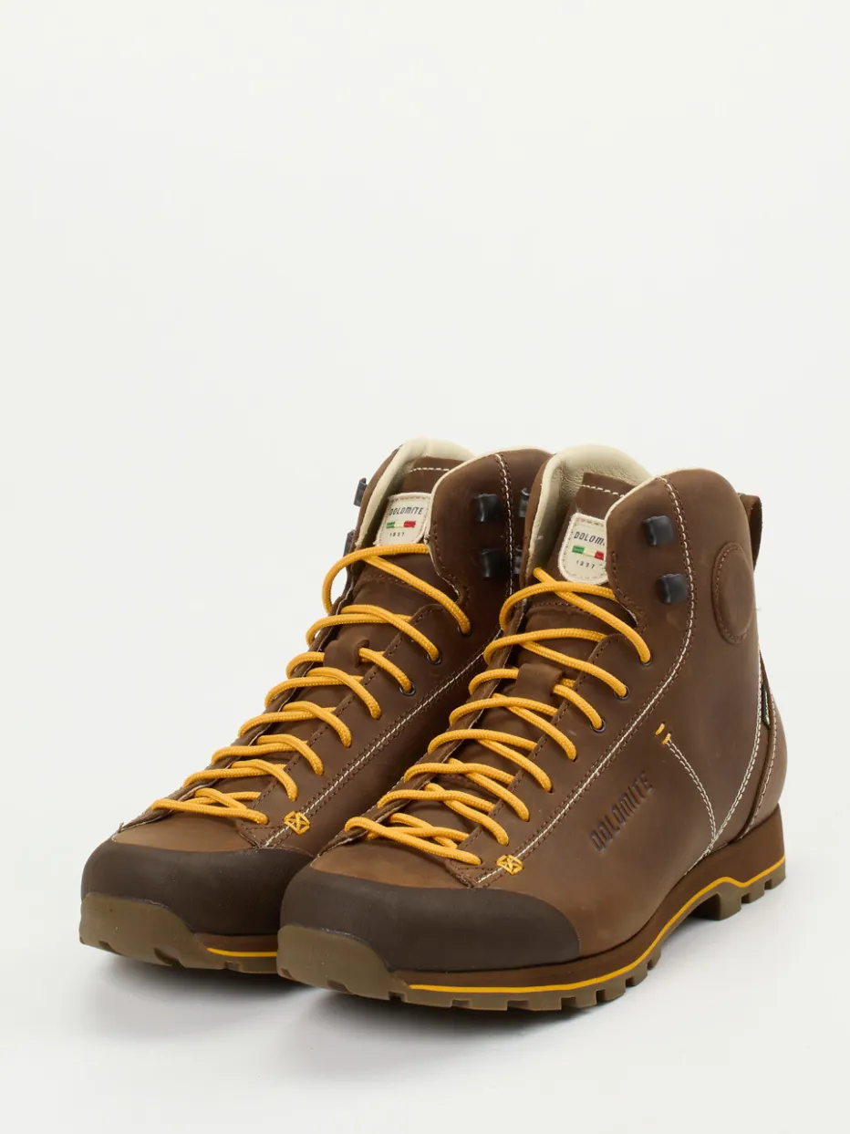 Robuster Klassiker mit Retro-Outdoor-DNA.Die Marke Dolomite präsentiert hochwertige Schnürboots für Outdoor und Freizeit. Mit ihrer wetterfesten GORE-TEX®-Membran erfüllen diese hochgeschlossenen Boots zuverlässige Anforderungen bei Wandertouren oder urbanen Ausflügen. Das matt gehaltene Glattleder in Mittelbraun wird durch gelbe Schnürsenkel, Kontrastnähte und eine italienisch eingefärbte Zuglasche akzentuiert. Die profilierte Vibram®-Gummisohle bietet stabilen Grip auf wechselndem Untergrund. Im Innenraum sorgt ein atmungsaktives Textilfutter für angenehmen Komfort. Optisch greifen die Stiefel Heritage-Elemente wie das geprägte Logo und Retro-Outdoor-Stil auf – ein Statement im aktuellen Gorpcore-Trend. Dolomite vereint funktionalen Anspruch mit stilistischer Substanz für anspruchsvolle Touren und den Alltag.