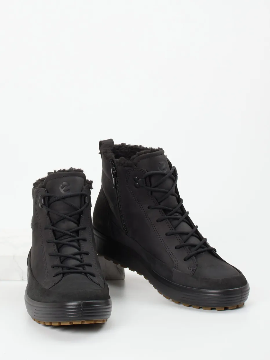 Für Komfort bei Kälte und Nässe.Ecco präsentiert mit diesen Stiefeletten ein vielseitig einsetzbares Wintermodell für Alltag und Outdoor. Die schwarze Variante aus wind- und wasserdichtem Nubukleder überzeugt mit matter Oberfläche und samtigem Griff. Ein warmes Textilfutter in Felloptik sorgt für angenehme Isolierung, während die griffig profilierte Gummisohle mit kontrastierendem Mittelbraun sicheren Tritt bietet. Der knöchelhohe Schnitt mit Reißverschluss und Schnürung betont die funktionale Silhouette. Dezente Details wie Ton-in-Ton-Nähte und Logo-Prägungen schaffen einen zurückhaltend urbanen Look, passend zum Quiet-Luxury-Trend. Kombinierbar zu Thermosocken und Outdoor-Wear. Ein wetterfester Winterschuh mit kompromisslosem Tragekomfort im Ecco-typischen Qualitätsspektrum.