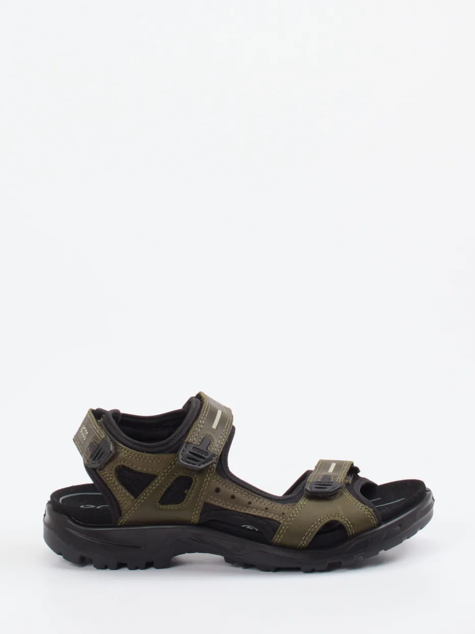 Komfortabler Halt für Outdoor-Erlebnisse.Die Marke Ecco präsentiert eine Herrensandale aus der Kategorie Trekkingsandalen. Ideal für sommerliche Wanderungen oder längere Spaziergänge in der Natur überzeugt das Modell mit funktionaler Ausstattung und robuster Verarbeitung. Das Obermaterial besteht aus hochwertigem Nubukleder, kombiniert mit Textil-Mesh für verbesserte Atmungsaktivität. Die olivgrüne Farbgebung, betont durch schwarze und rote Akzente, wirkt modern und naturnah zugleich. Breite, gepolsterte Riemen mit Klettverschluss sorgen für eine individuell anpassbare Passform. Die profilierte Gummisohle bietet Trittsicherheit auf unterschiedlichsten Untergründen. Reflektierende Details unterstreichen den Outdoor-Charakter. Ecco vereint Funktionalität mit minimalistischem Designanspruch für komfortorientiertes Gehen im Gelände.