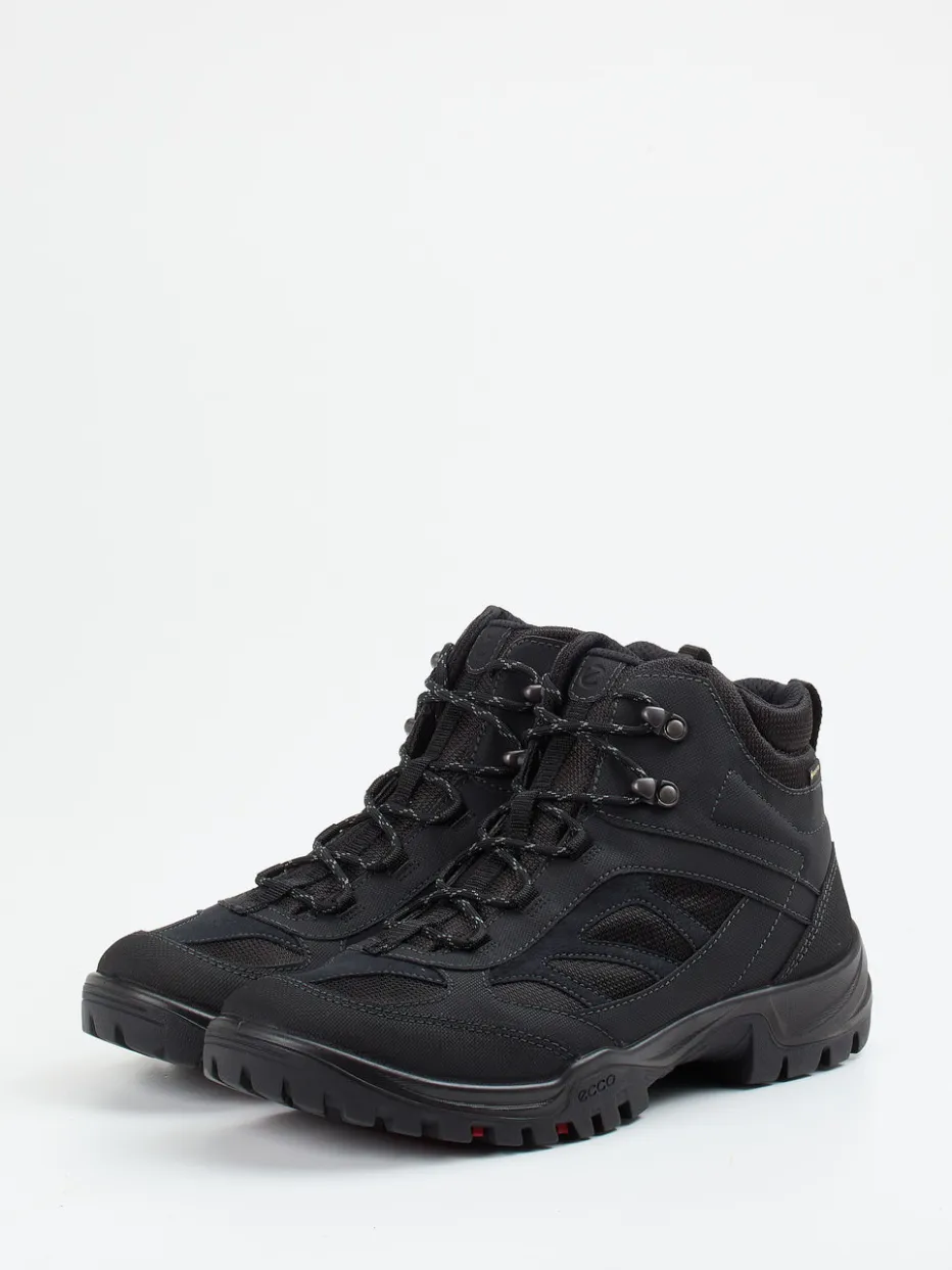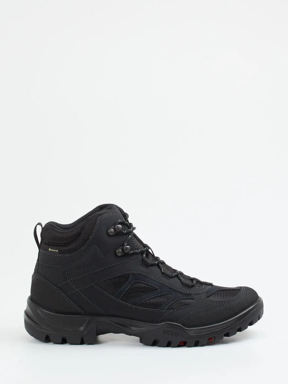 Ob bei Nässe, Wind oder Schotterwegen – das wind- und wasserdichte Obermaterial aus Synthetik mit atmungsaktiven Mesh-Einsätzen sowie die GORE-TEX®-Membran sorgen für ein trockenes Tragegefühl. Der schwarze Mid-Cut-Schuh wirkt durch reflektierende Details und die matt strukturierte Oberfläche technisch-modern. Die rutschfeste Gummisohle mit roten Grip-Zonen bietet sicheren Halt, während Metallösen mit Haken die Schnürung funktional ergänzen. Ideal für sportliche Looks im „Gorpcore“-Stil und kombinierbar mit Funktionsjacke und Rucksack.