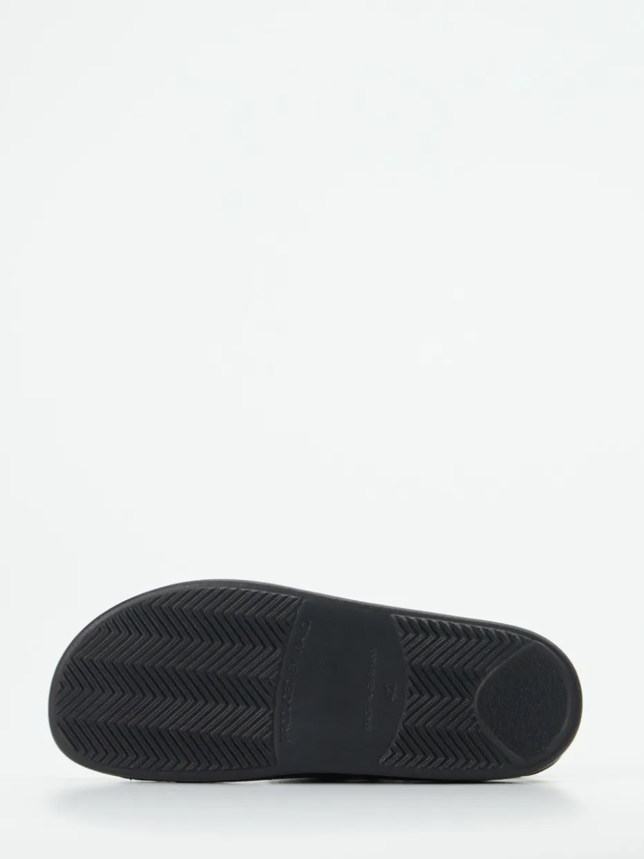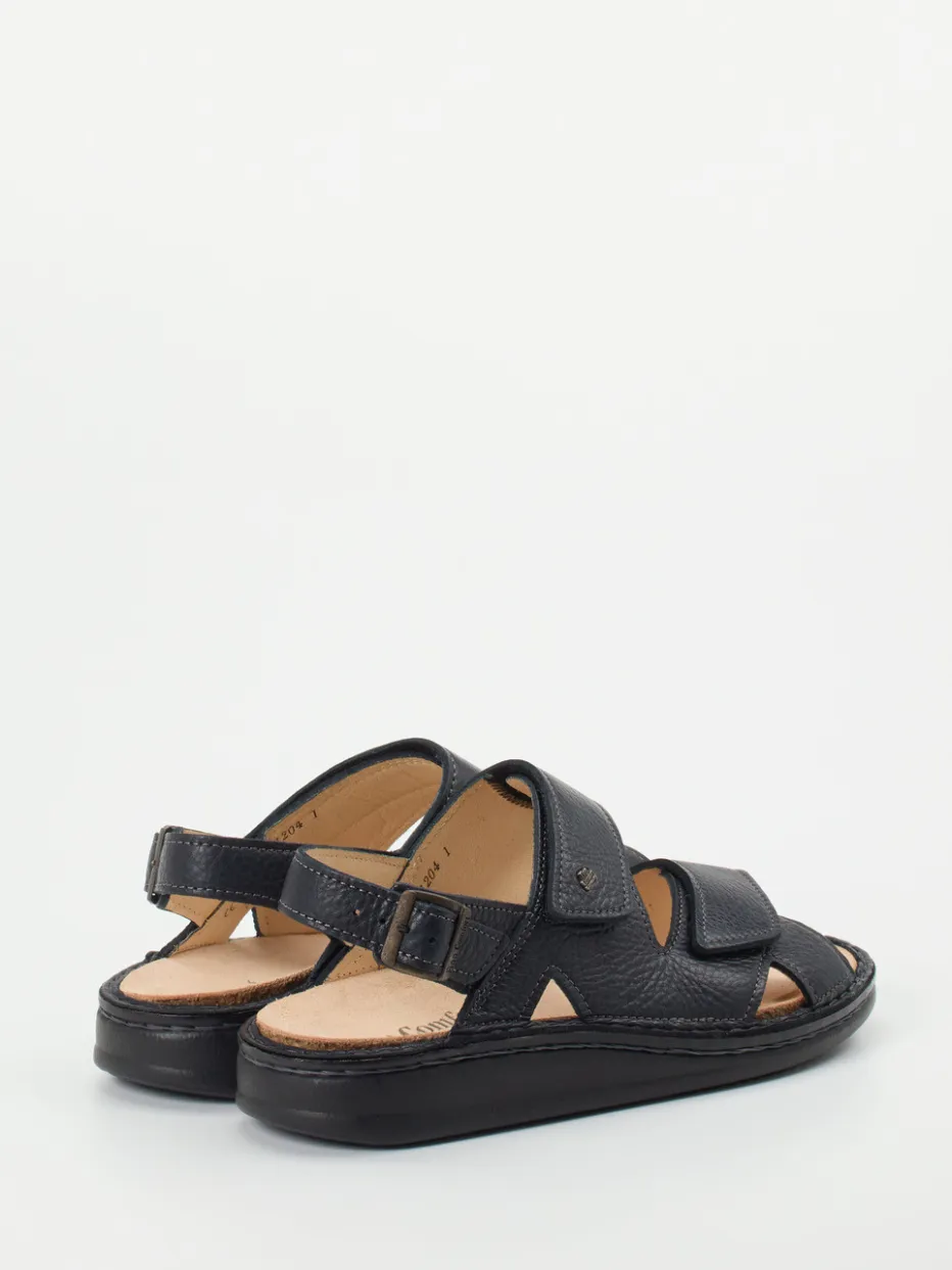Das dunkelblaue, genarbte Fettleder wirkt robust und gleichzeitig edel. Zwei breite Klettverschlüsse und ein verstellbarer Fersenriemen mit bronzefarbener Metallschließe erlauben eine individuelle Passform. Das herausnehmbare, lederbezogene Fußbett ist orthopädisch geformt, während die rutschhemmende Gummisohle sicheren Tritt bietet. Fein abgestimmte Ton-in-Ton-Nähte und ein dezentes Metalllogo runden das Design stimmig ab. Der Look passt zu lockeren Leinen-Outfits oder sportivem Relaxwear-Stil.